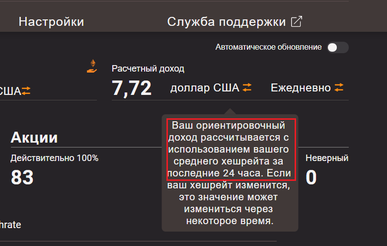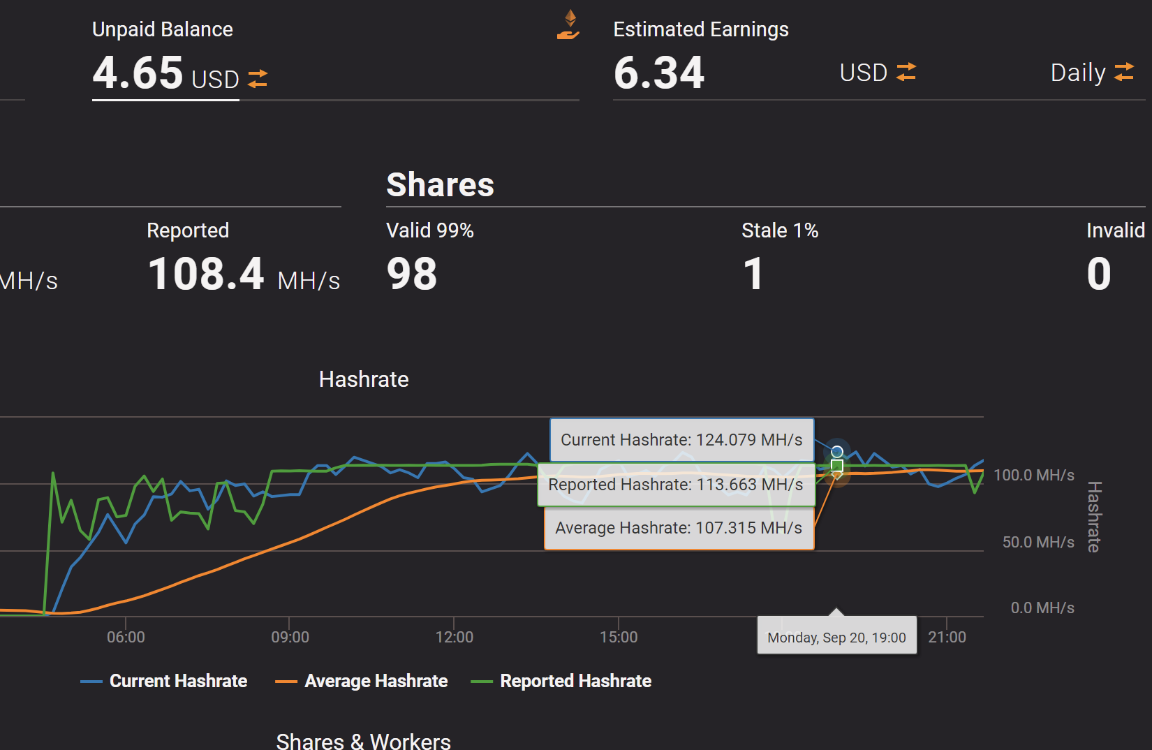ну тут не вариант, потому что много чего мне на компе надо делать.Сейчас перешел на езермайн..показывает кривую примерно 120m.h..... намного профитнее получается чем на пуле бинанс..6 доларов за пол дня получилось запустил утром попробовать..Посмотрим сколько будет завтра.Но выглядит намного привлекательней чем пул бинанс.Ясное дело если ничего не делать на компе фарм будет лучше.Но комп собирался не для майнинга.Если с прогнозом на выплату то получается при мерно 11 долларов..А у тебя сколько в сутки выходит?просто что бы мне уже понимать сколько теряю иза того что комп загружен.Насчет памяти попробую еще поднять ок....