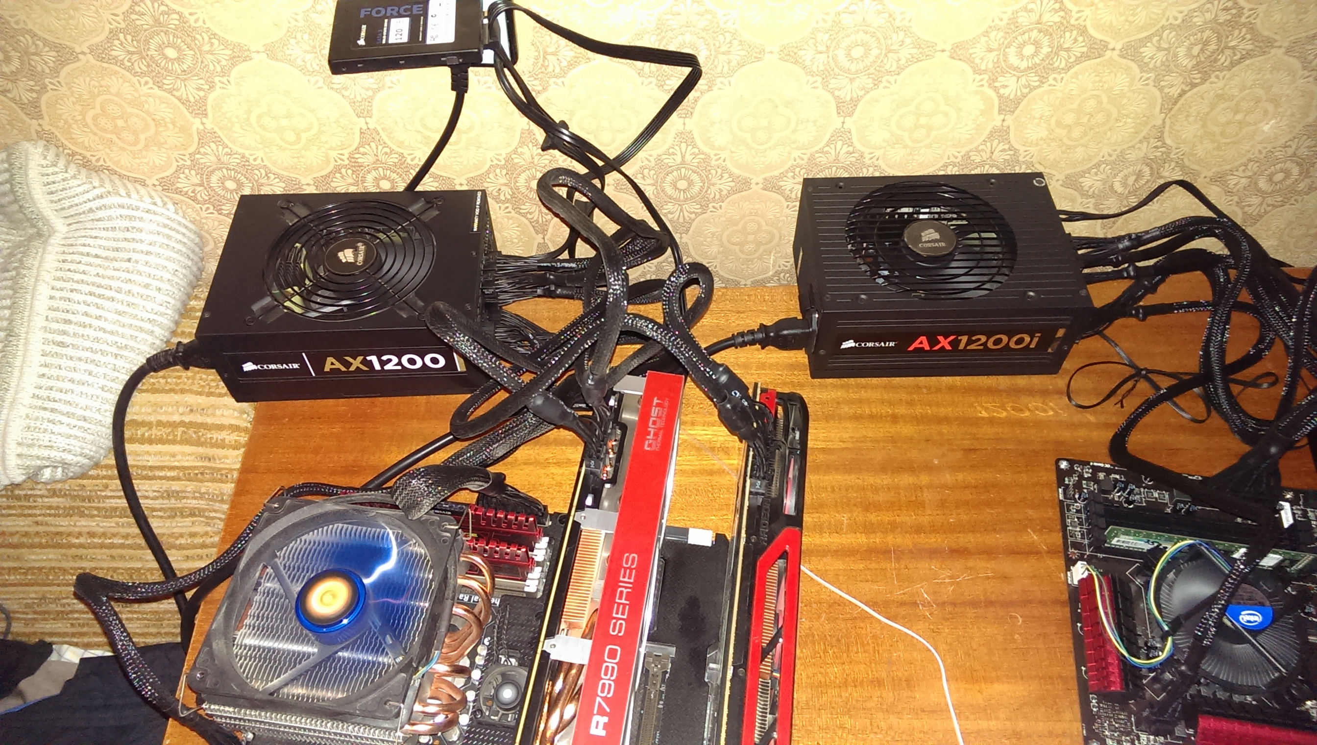 googayo У тебя что то с БП(Какой он у тебя кстати?).У меня работают 4х7990, 3 из них GHOST(референс лучше).И ничего не подгорает.Ещё 4 таких 7990 ждут БП и райзеров. БП кстати у меня Corsair AX1200i и AX1200.