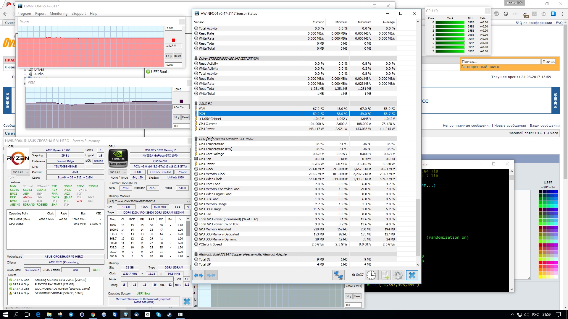 Стандартной системы охлаждения R7 1700 хватит даже на небольшой разгон, но лучше всё таки раздобыть что-то с тепловыми трубками. Если ваша старая СО она крепилась к AM3 не зацепками, а винтами, то без помощи производителя, похода в магазин (если вообще бывают такие магазины, где продают комплекты креплений для СО) или колхоза вы её на AM4 не приткнёте. Зато если были зацепки, то проблем быть не должно. Если вы решили брать новое СО, то обратите особое внимание на совместимость с AM4 конкретного выбранного вами экземпляра в магазине, т.к. даже если на сайте производителя написано, что они, например, поставляют с креплением для AM4 в комплекте, у магазина может быть запас ещё с тех времён, когда они поставляли без такого крепления, и потом вам останется только просить у магазина принять товар обратно (что магазины очень не любят делать, особенно если вы его распаковали). Рабочей на Ryzen является температура до 75 градусов (реальных, а не с оффсетом SenseMI). При перегреве процессор сначала снижает множители на конкретных ядрах (некоторые называют это "троттлинг"), если это не помогает, система выключается и может не включаться, пока он не остынет, или выдавать ошибку о перегреве при загрузке (видел оба случая, но не уверен как это точно работает).