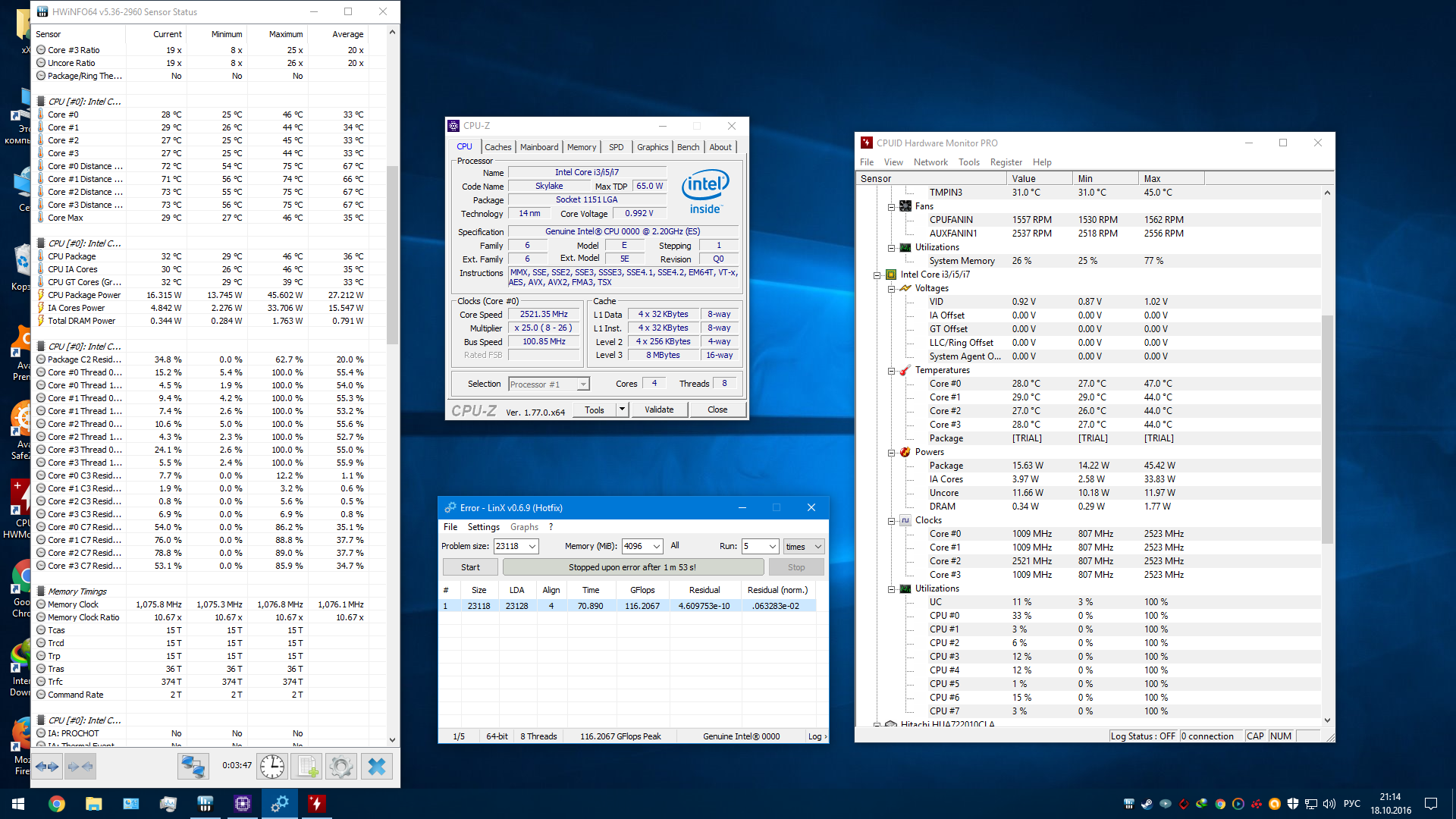 Что-то температуры подозрительно низкие все таки. Может из-за отсутствия микрокодов с датчиков неверные данные снимаются...точнее неверно интерпретируются? Ну даже с учетом 1.152v для 4 ядер+HT 49 градусов...как-то мне сложно поверить. У меня просто на i3 6100 3.7Ghz в стоке такие температуры под linX : ))) как раз 48-50. Кулер igloo H46 Ну и 27W энергопотребление проца....