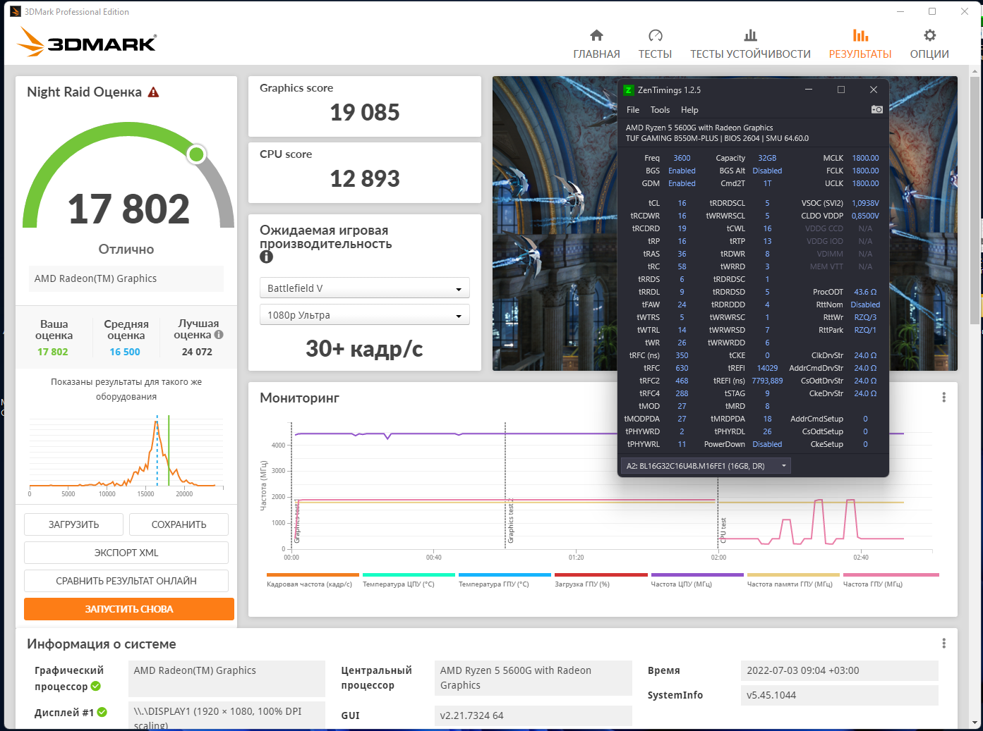 vol2008 я тоже вчера погонял, выложить не успел. Память 3800-4000 CL16 (не меняя таймингов), GPU фикс 2000-2200 МГц, курва GPU в стоке, увеличение частоты CPU выключено, только лимиты большие. Видеопамять 1 Гб. Показания проца плавают вверх-вниз, а вот по графике зависимость четкая. И от 200 МГц частоты GPU больше прирост, чем от 200 МГц памяти.