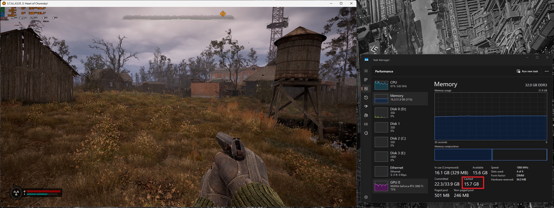 Между прочим многие кто 32 юзает не знает что можно получить прирост от 64 и выше даже если игре хватает по мониторингу 32 гигов. Все дело в том что винда кеширует ресурсы игры в памяти и когда они становятся нужны читает их не с медленного накопителя, а с ОЗУ, в итоге фризов меньше 1% и 0.1% выше.