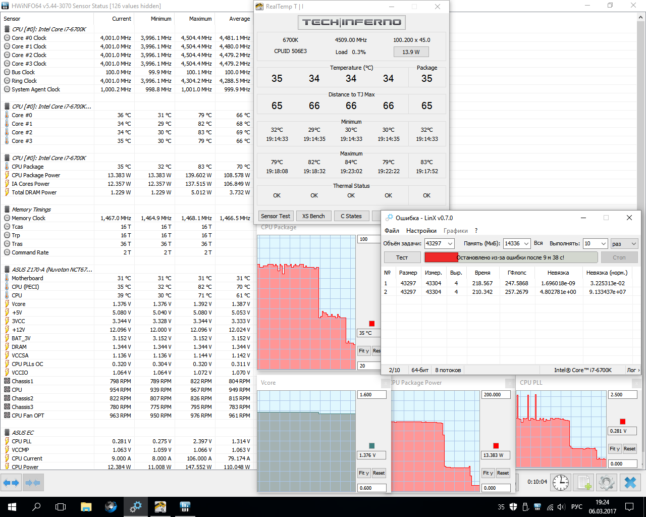 Выставил 4500мгц, все остальные параметры на авто. Linx ошибки не выдает, но напряжение под нагрузкой достигает 1.360в. Температура до 88 с дельтой 10 градусов между самым горячим и самым холодным ядром. В играх максимум температуру видел 70.