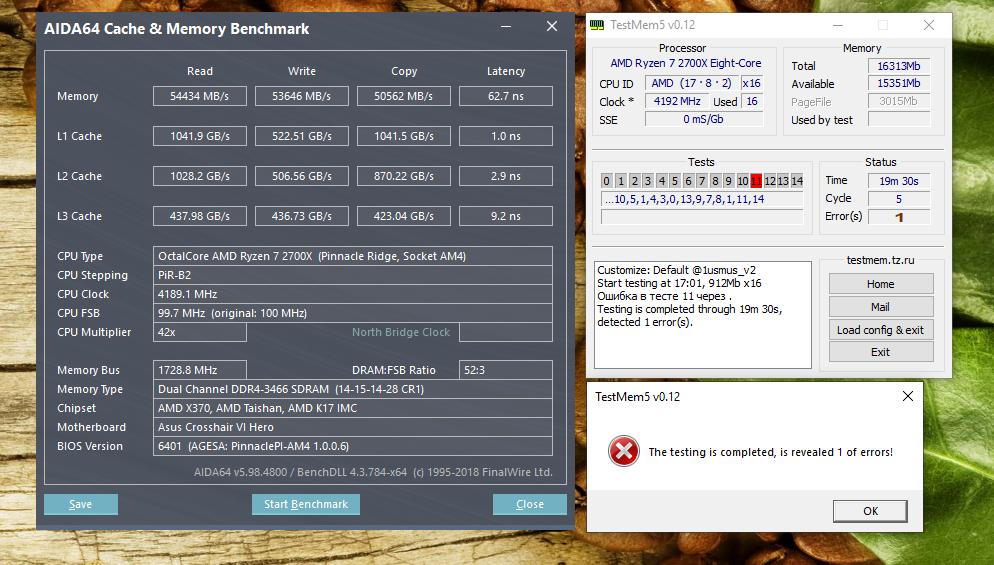 Доброго времени суток. Никак не могу побороть единственную ошибку в конце теста tm5 с конфигом куратора. Частота 3466. Планки g.skill f4-3000c14d-16gtzr 8x2. Есть какие-нибудь советы? crosshair vi hero 2700x 4.2 1.35v soc 1.05v dram 1.43v