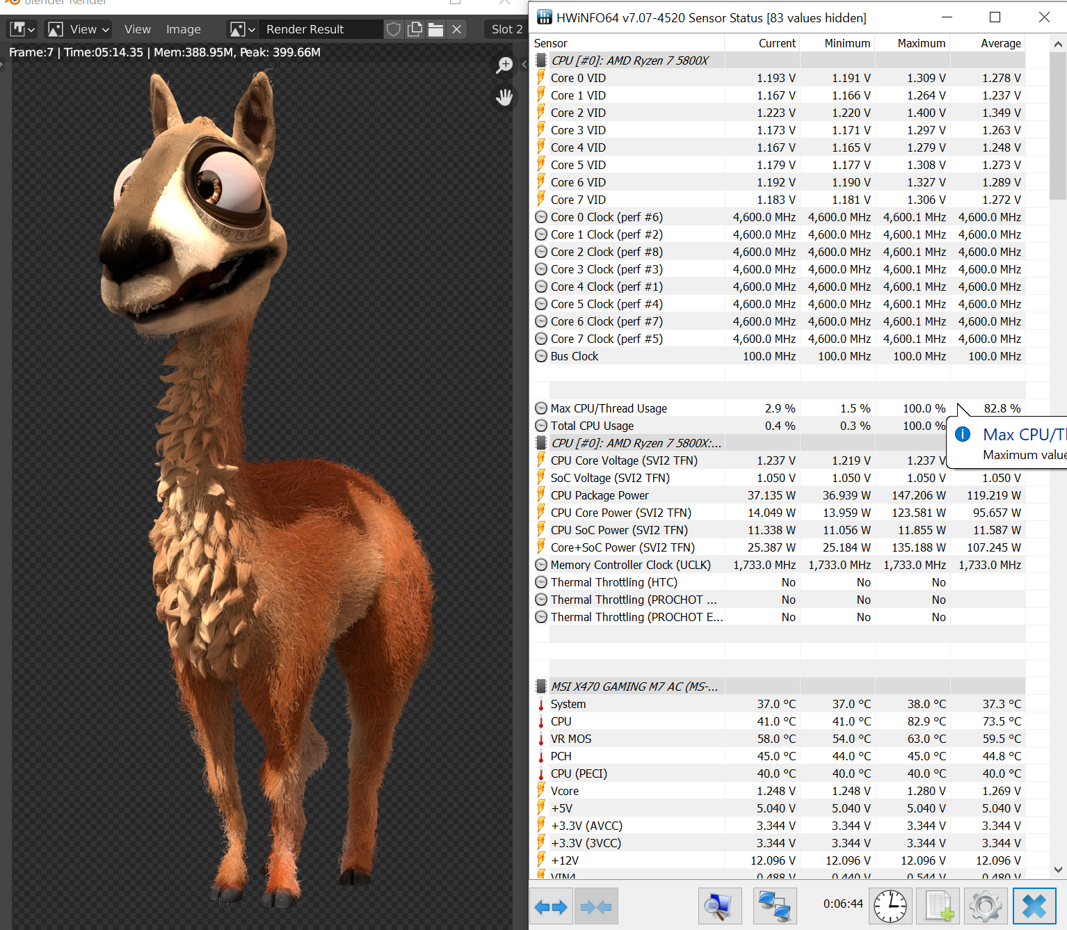 Lorichic Спасибо) Получается почти одинаковый результат в СВ23. Я поднял память до 3600 и получилось ~15400 очков Примерно одинаковые процы. Что на 3.5% меньше вашего результата при частоте на 1% меньше. По потреблению то же примерный паритет. Вот прогнал Coro в Blender - ну эта хорошая такая нагрузка - СВ23 курит в сторонке)