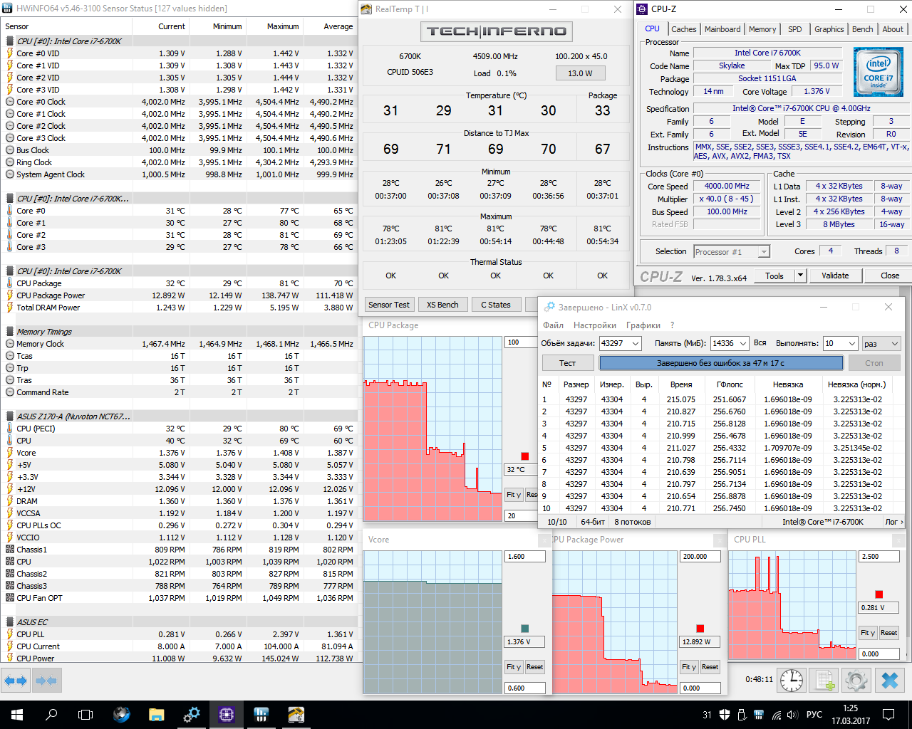 i5-6600K @ 4500МГц, LinX 0.7.0 и Aida64 "Stress FPU"
