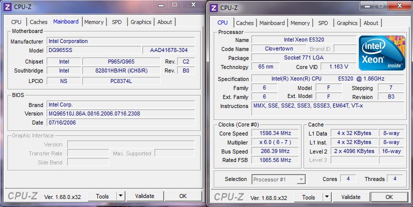 Приобрел давеча плату Intel DG965SS на G965, на дачу системник собрать. Воткнул Xeon E5320 - заработало, к удивлению. Ибо, во-первых, интел. Во-вторых, заявлена поддержка только 65нм core 2, ни 45нм процев, ни даже q6600 не указано. Жаль только, что 333 шину не держит. С E5345 и E5335 не заработала. Зато завелась даже с L5408 (единственный в своем роде 45нм-квад с 266 шиной), но после загрузки винды сразу ребут. Не знаю, в чем дело, желания разбираться особо не было, так как L5408 на нее ставить не буду. Классный проц кстати, реально холодный. Возможно сия информация кому-то окажется полезной.