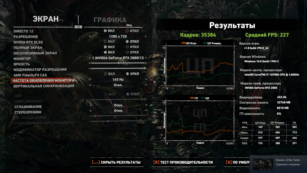 Добавлено спустя 2 минуты 1 секунду: SINgle84 У меня тоже видяха до 97% загружается там. Но я тестил 5100 5200 и 5300 и там идет прирост от частоты проца, т.е 5300 быстрее всего и так же на память реагирует, т.е 4600 быстрее чем 4500. Именно по кадрам которые вот 25000 значение. А так средний фпс да +- 1 херня и разброс есть в зависимости от прохода, но я так понимаю, чем выше показатель кадров. тем комфортнее в игре именно по 0.01% фпс и 1% фпс т.е чем больше кадров тем меньше просадок которые не видно глазом. Интересно было бы если бы ребята с 10700к и 1080ти протестили так же так сказать лоб в лоб 8 ядер вс 10.