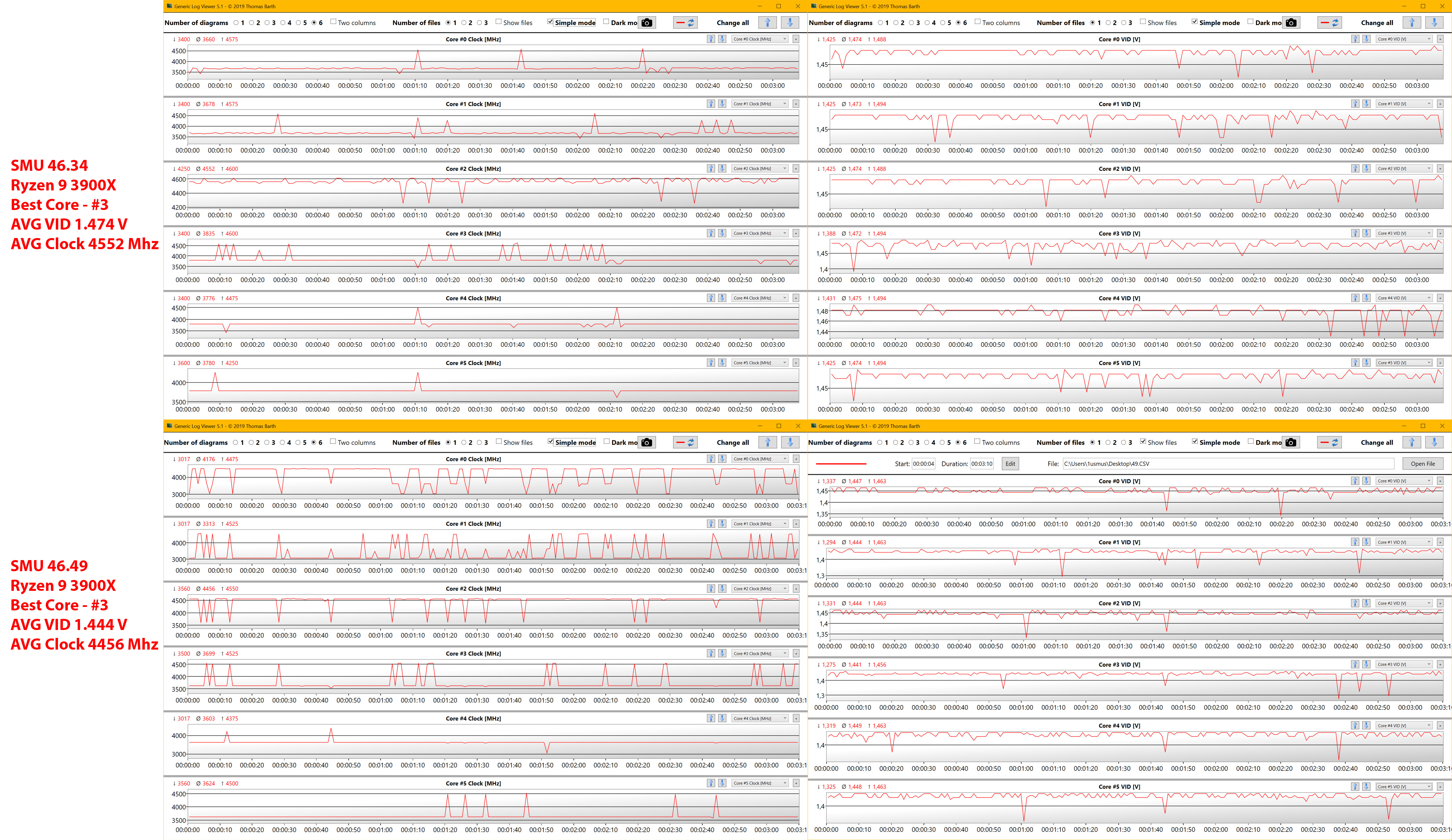Теперь возвращаемся что же такое 46.49.00. Главной идеей было получить буст при том же энергопотреблении. Решение оказалось очень простым, мы жертвуем устойчивым бустом на успешное ядро и умело жонглируем короткими пиками по всем успешным ядрам. То-есть проц в однопоточке вместе с планировщиком заняты жонглированием ядер со всеми вытекающими последствиями. Этого времени переключения достаточно чтобы пользователь увидел паспортную частоту и энергопотребление, которое аналогично или даже чуть меньше чем на прошлых SMU.