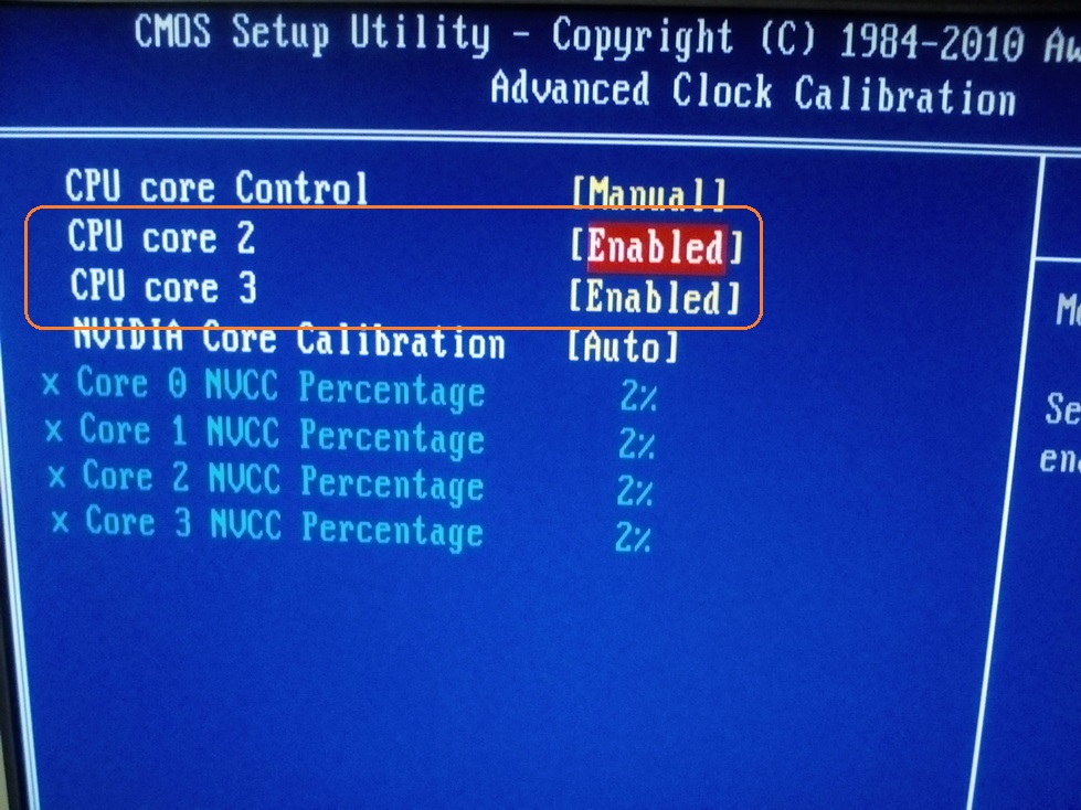 У меня то случай поинтересней, стоит включить систему разблокировку ядер и компьютер жестко зависает в начале загрузки ОС без всяких ошибок, скорее всего отключается питание некоторых модулей, так как гаснут все USB устройства...при этом не важно сколько и в каком сочетании активных ядер...хоть все 4, хоть только одно первое. Я даже сменил системную плату и ничего не поменялось.