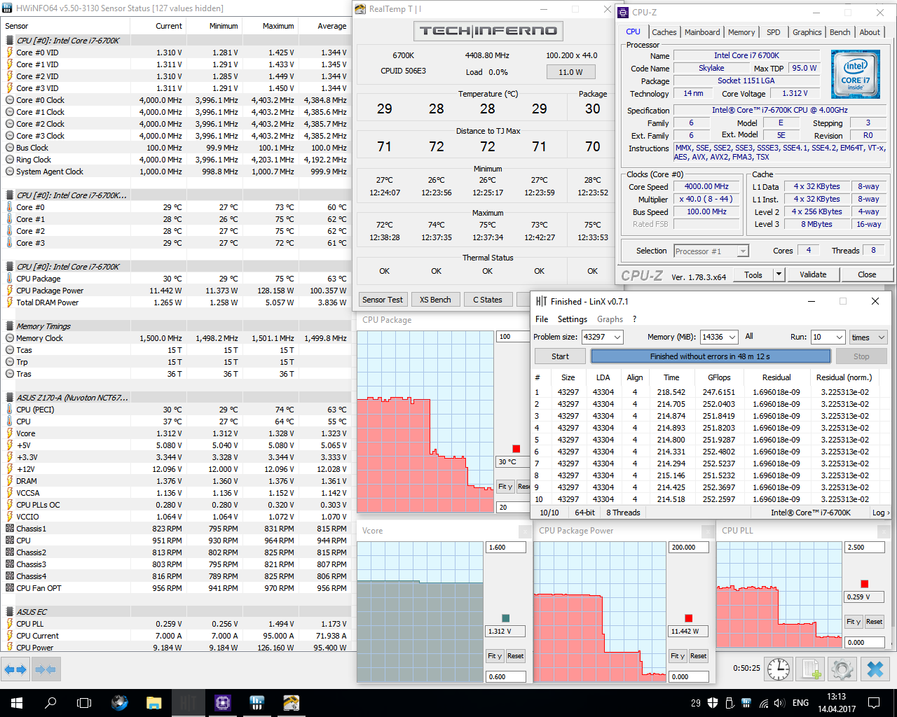 Atheros За скальп ещё раз спасибо! Поставил на свой бывший (6700K) бенч проц Ice Hammer Hybrid. В пассиве,без воды. Вертушка штатная ужасная, с писком мотора . Так вот, 1.2v 4100Mhz Два часа смотрели кино. Макс 57 градусов Системник на подоконнике закрыт плотной занавеской, циркуляция воздуха так себе. Окна все закрыты.