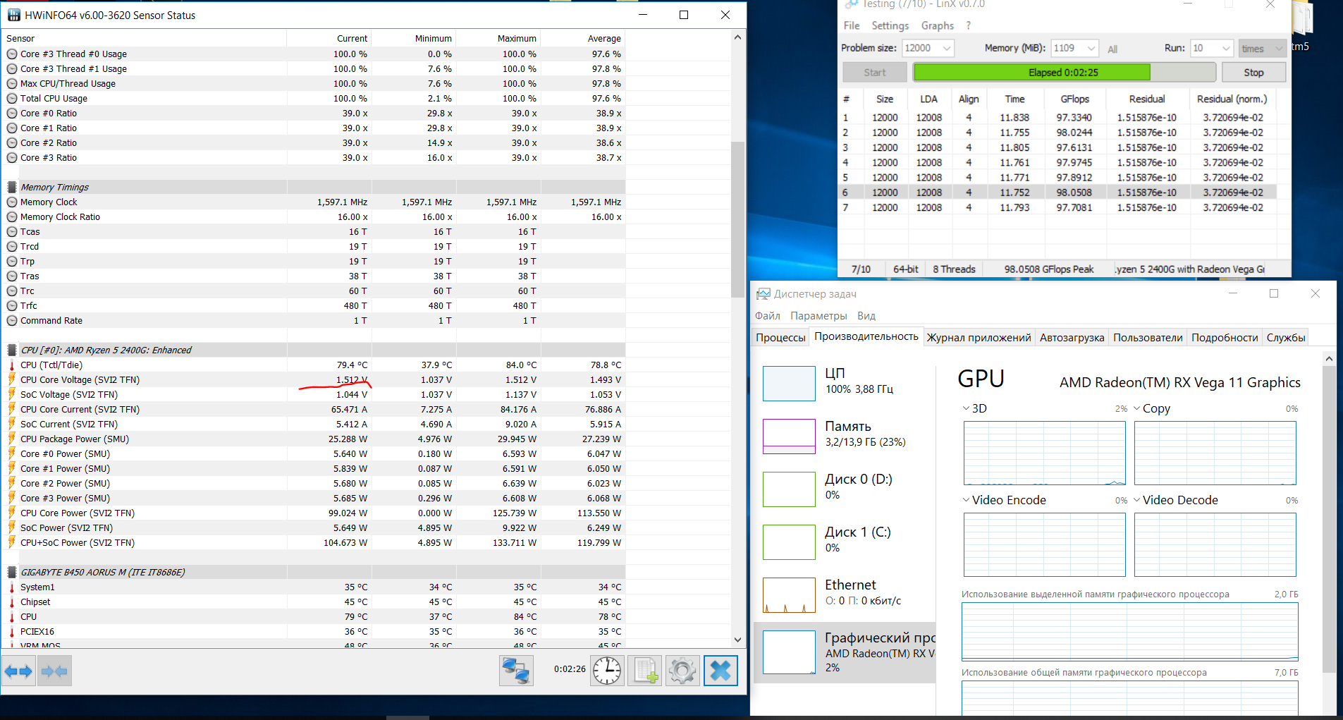 Сегодня уже второй раз такой глюк словил. После ребута - захожу в Hwinfo и запускаю Lynx . Проц в сотке - вольтаж 1,5 и больше, температура >80 . 3д марк запускаю - набирает естественно меньше попугаев в половину... И так постоянно, пока не ребутнешь комп. После ребута все в норме становиться, при 100 процентной загрузке темпер не больше 70. Данная ситуация была сегодня при офсете на проц -0,1 , и потом спустя какое то время повторилась на Auto вольтаже...Вопрос - почему так может быть, ни у кого не было похожей ситуации что просто вот так задирается вольтаж на проц? Биос f4, оперативка в разгоне до 3200 пресетом из калькулятора, 16-19-19... Мне что то страшно становиться - запустят комп когда меня дома не будет - и кирдык...Есть подозрение что такая петрушка стала после установки Ryzen Master... Либо я не замечал этого раньше так как не мониторил темпер и напряжения. Вообщем я хз как быть - мать назад что ли возвращать в магаз или проц. или снять разгон с оперативки и потестить