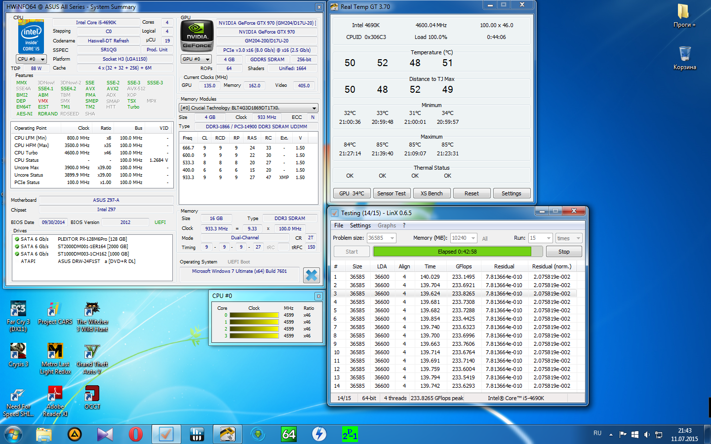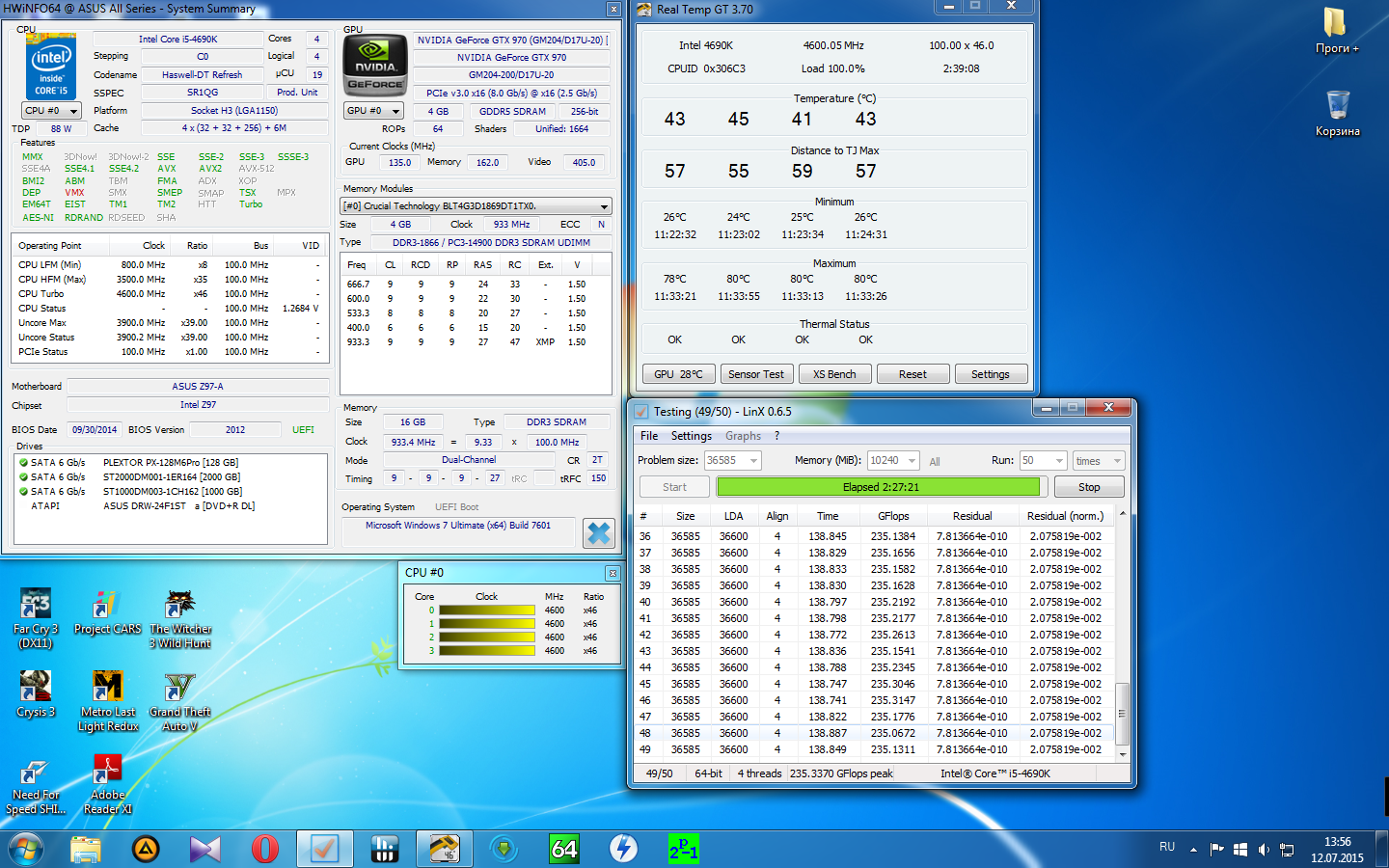 Все!!!! 4,6 стабильно! Два дня проверял! Прайм 5 часов без проблем! Потом Линкс с разным количеством памяти, но не менее 6144, по 15-30 прогонов. Температура по трём ядрам 85 по первому 84. Напруга даже меньше чем ранее была. Сейчас 1.268V. Но все равно разобрал, поменял ЖМ и термопасту. Хз может в дальнейшем ещё t упадёт. Всем спасибо за помощь и советы!!!!