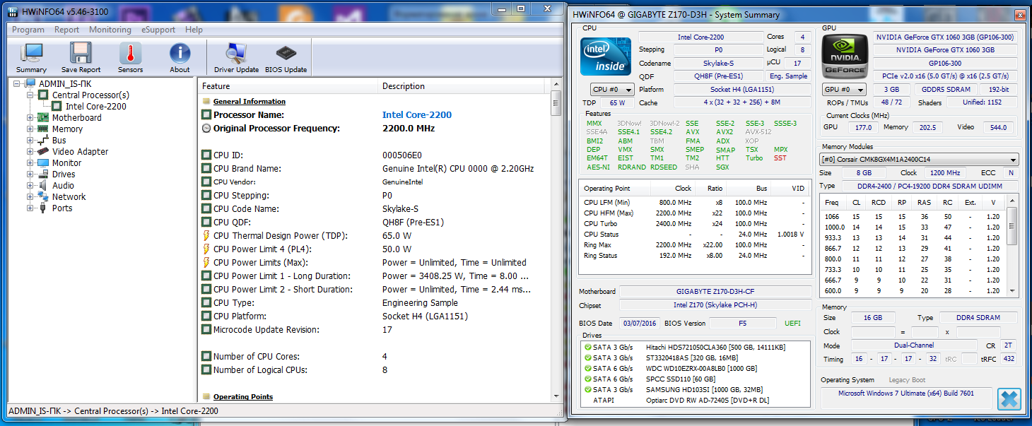 Gigabyte Z170-HD3 DDR3 (F5 + микрокоды), QHQG L501, стоковое напряжение 1.090 в., встроенное видео, PCI-E 3.0, двухканальный режим памяти работают.