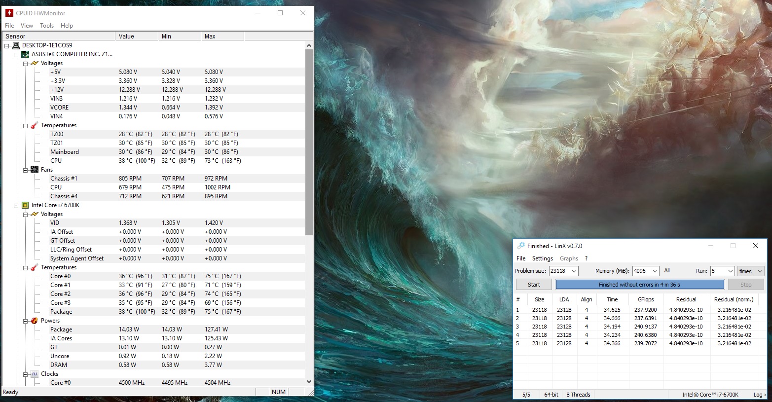 Может, будет интересна статистика. Ничего не вылетало, ошибок в boinc'е нет. На данный момент комп юзаю только я, можно гонять 24/7 хоть весь месяц. Только вот никак не подберу, как лучше всего соотнести обороты вертушек, чтобы и тихо было, и эффективно? CPU, CPU OPT - это понятно, Chassis 1 и внезапно 4 - это две штуки на вдув спереди, Chassis 2 - выдув сзади, Chassis 3 - вдув снизу.