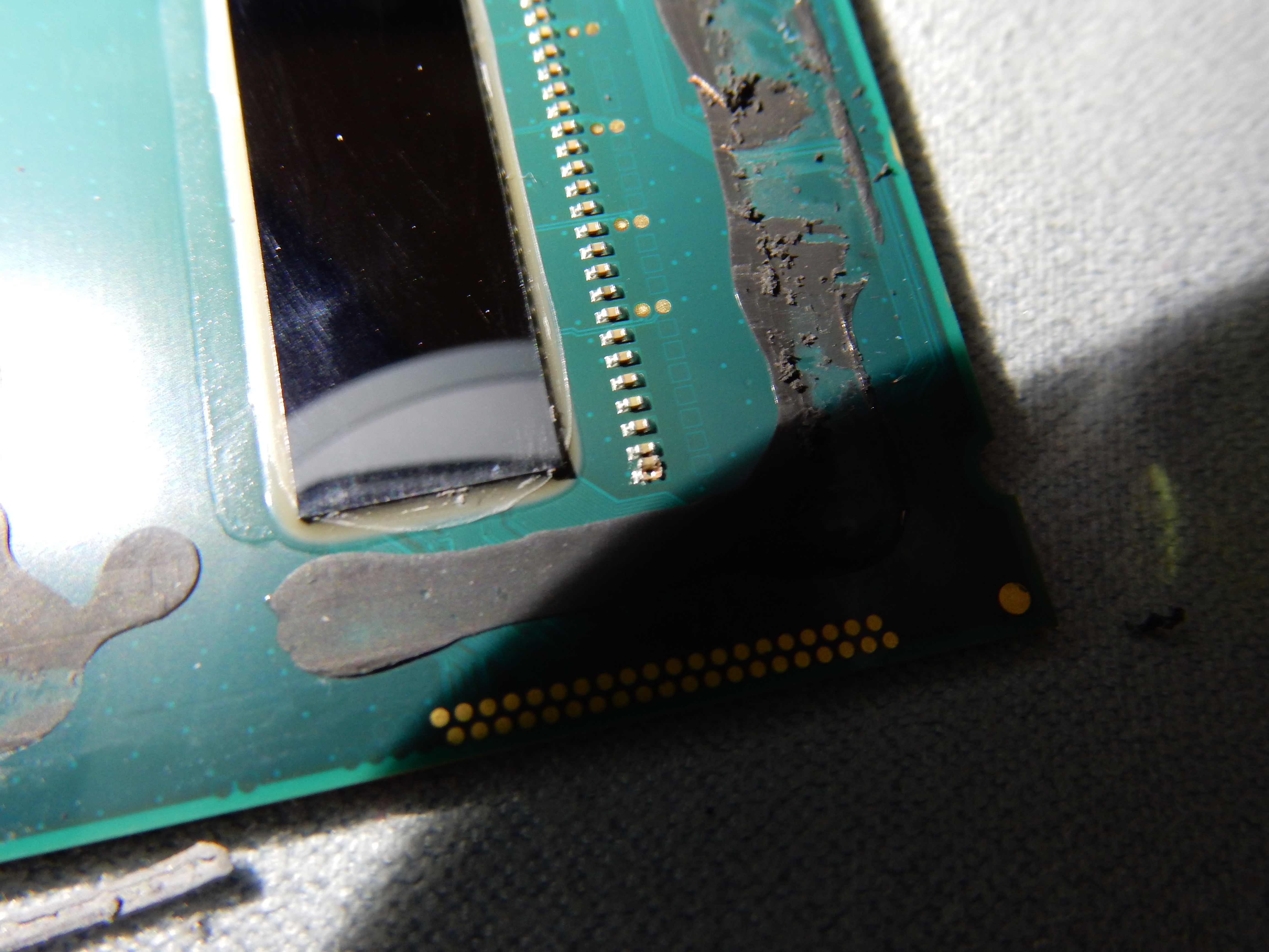 Резал герметик на 775 сокете с припоем, на глаз слой герметика там был толще раза в 2-3, может больше. 775й проц можно было легко вскрывать канцелярским ножом, а на 1155/1150 самое тонкое лезвие бритвенное плохо пролезает.