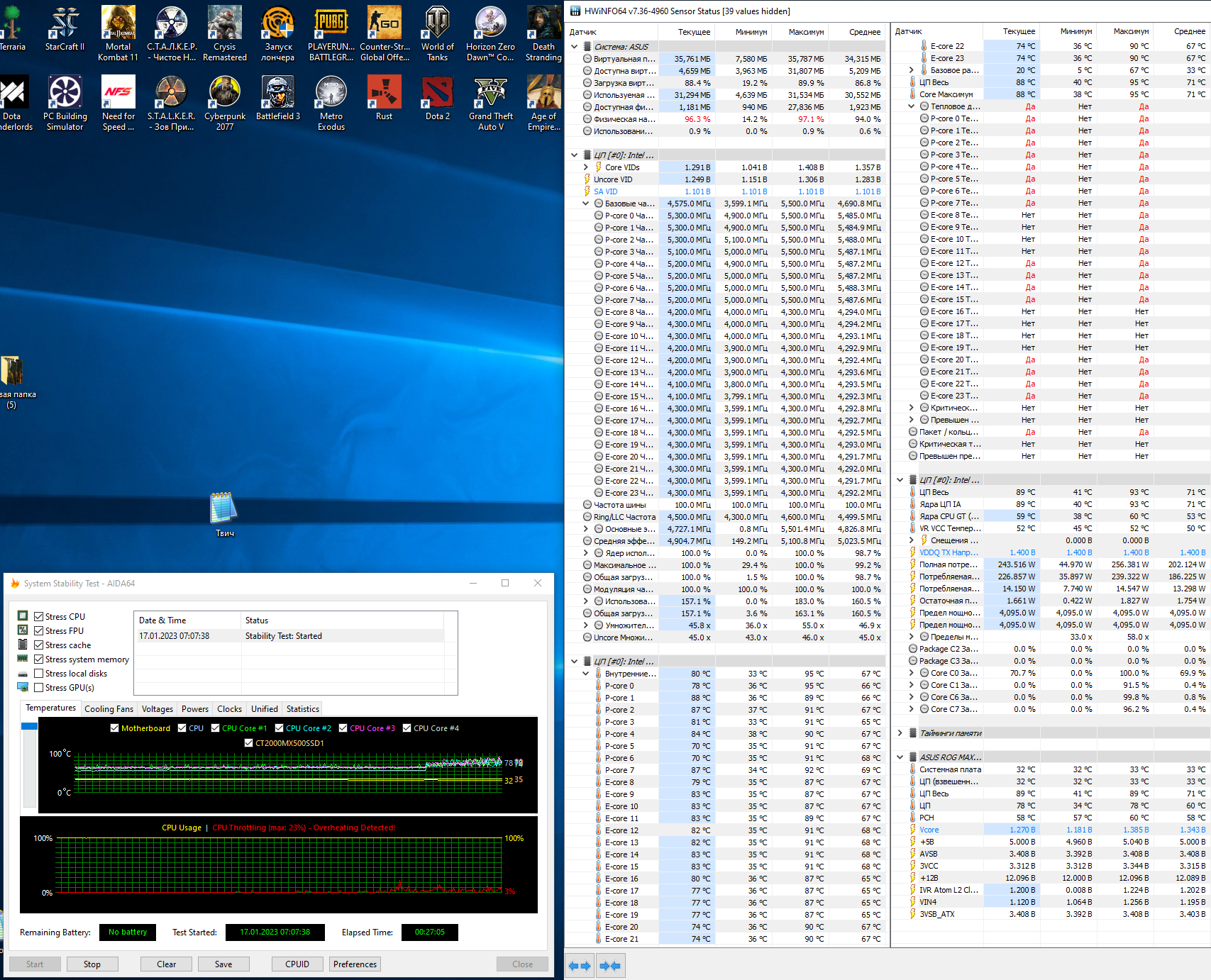 Подскажите, а что тут собственно тротлит? температуры в районе 90 градусов, тротлинг же при 100 начинается или в новых процах это по другому работает? или это настройки материнки ограничивают? проц 13900K (сток), материнка Asus Rog Maximus Z790 Hero, напряжение при такой нагрузке в авто норм или надо чего подкрутить? Степень удачности P ядер 109, я так понимаю это середнячек? общий SP 100