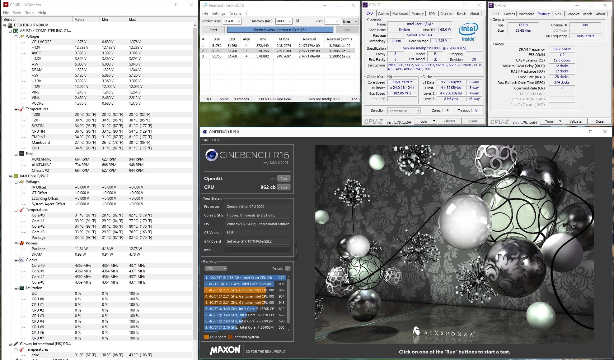 То же самое, что и под крышкой QHQG. Разницы я не увидел. Свой проц я тоже все-таки проскальпировал. Градусов 20 скинул. Сейчас прощупываю работу процессора на новых для него частотах. На частоте 4440 МГц LinX успешно прогнал 8ГБ тест при напряжении 1.44 В. Но это так, ради эксперимента. А ближе к постоянке пока нашел частоту 4368 МГц при напряжении 1.38 В. Максимальная температура 82 гр.