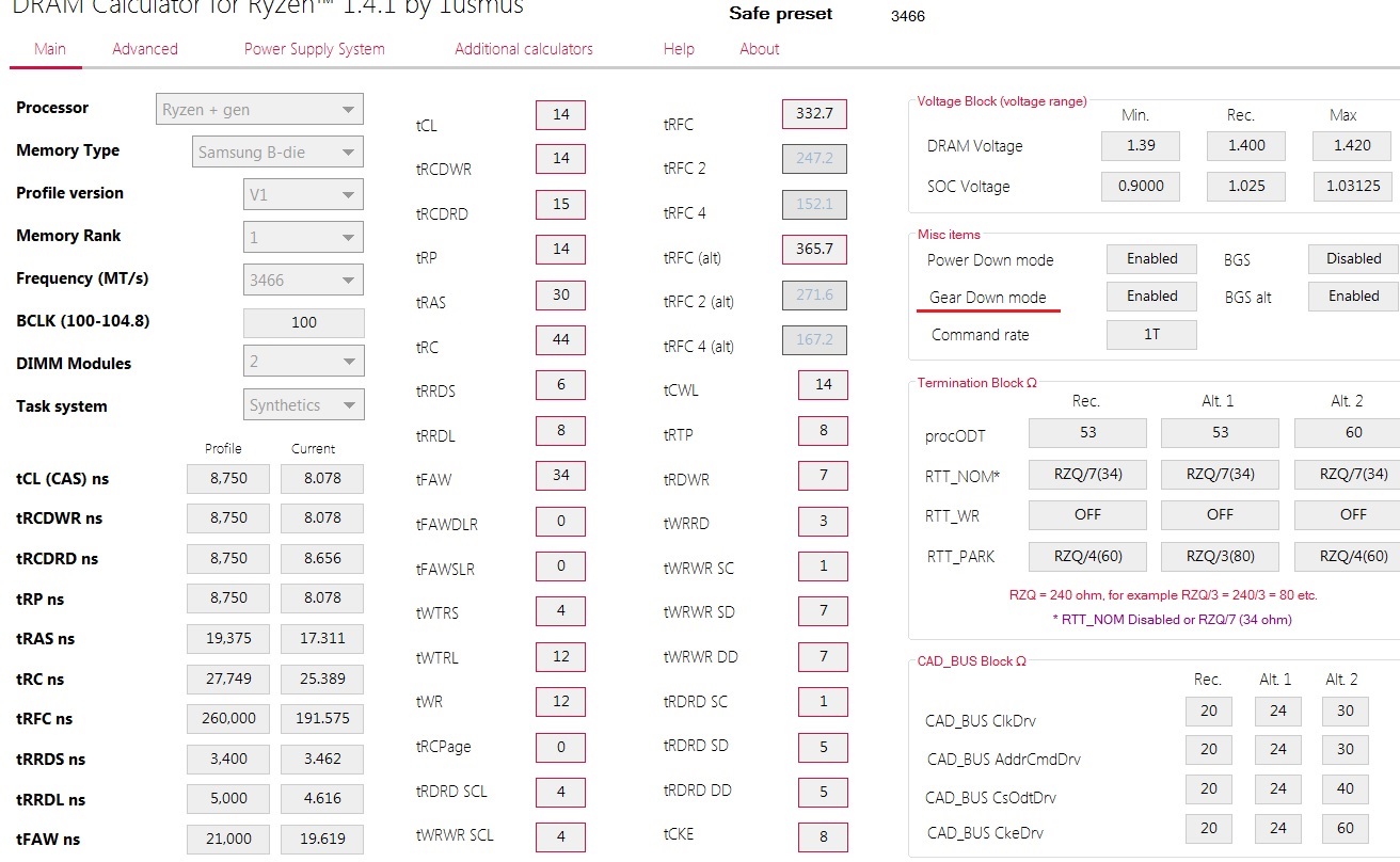 Сразу вопросы (вы уж простите, я в этом деле совсем дуб): 1. На сколько верно показывает RDC напряжение на память и SoC? Критично ли, что у меня SoC допустим 1.050, а калькулятор говорит максимум 1.031 или стоит начинать именно с цифр калькулятора? Где то читал, если повышаем SoC, то снижаем напряжение на память и наоборот, это верно? 2. Gear Down Mode за что отвечает эта функция? Стоит ли ее включать или по аналогии с Power Down Mode отключить? Потому как в безопасном пресете оба включены, в быстром - отключены. Не наврежу ли я памяти или контроллеру отключив конкретно GDM? С PDM понял, что его отключение снижает задержку и в итоге получаю более высокую скорость. 3. Очень ли критична функция BGS? Я ее вообще в БИОС найти не смог в настройке таймингов. 4. Power phase control стоит Standart, а в DRC есть вкладка где описаны уровни LLC и фаз. Надо ли ее делать как говорить калькулятор, там местами есть extreme? Или это для оверклокеров и рекордов?
