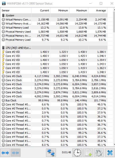 https://www.hwinfo.com/version-history/ Исправлено сообщение о стадии ES / Production для некоторых процессоров Zen2. Исправлено измерение BCLK для некоторых процессоров Intel под Windows 7. Добавлена отчетность по высокотемпературному пределу тактовой частоты процессора для семейства AMD Zen2. Добавлено сообщение о смещении автоматического разгона процессора для семейства AMD Matisse. Добавлен новый (более надежный) метод измерения BCLK в системах AMD Matisse. Добавлен мониторинг часов контроллера памяти (UCLK) для семейства AMD Zen. Добавлена предварительная поддержка Intel Elkhart Lake. Исправлено сообщение о емкости NVMe при размере данных LBA> 512B. Добавлены отчеты по температурному пределу процессора и температурному пределу HTC для AMD Zen. Обновлены отчеты по току / мощности CPU VDD и SoC SVI2 на некоторых материнских платах MSI. Добавлен мониторинг температуры для каждой ПЗС-матрицы для AMD Zen2. Улучшена поддержка нескольких устаревших (ISA, VLB) (S) VGA-адаптеров. Исправлено отображение оборотов вентилятора графического процессора на AMD Navi. Добавлен мониторинг напряжения, тока и мощности графических процессоров ICX RTX серии 20. У кого там проблемы с вольтажом, проверьте бетой новой.