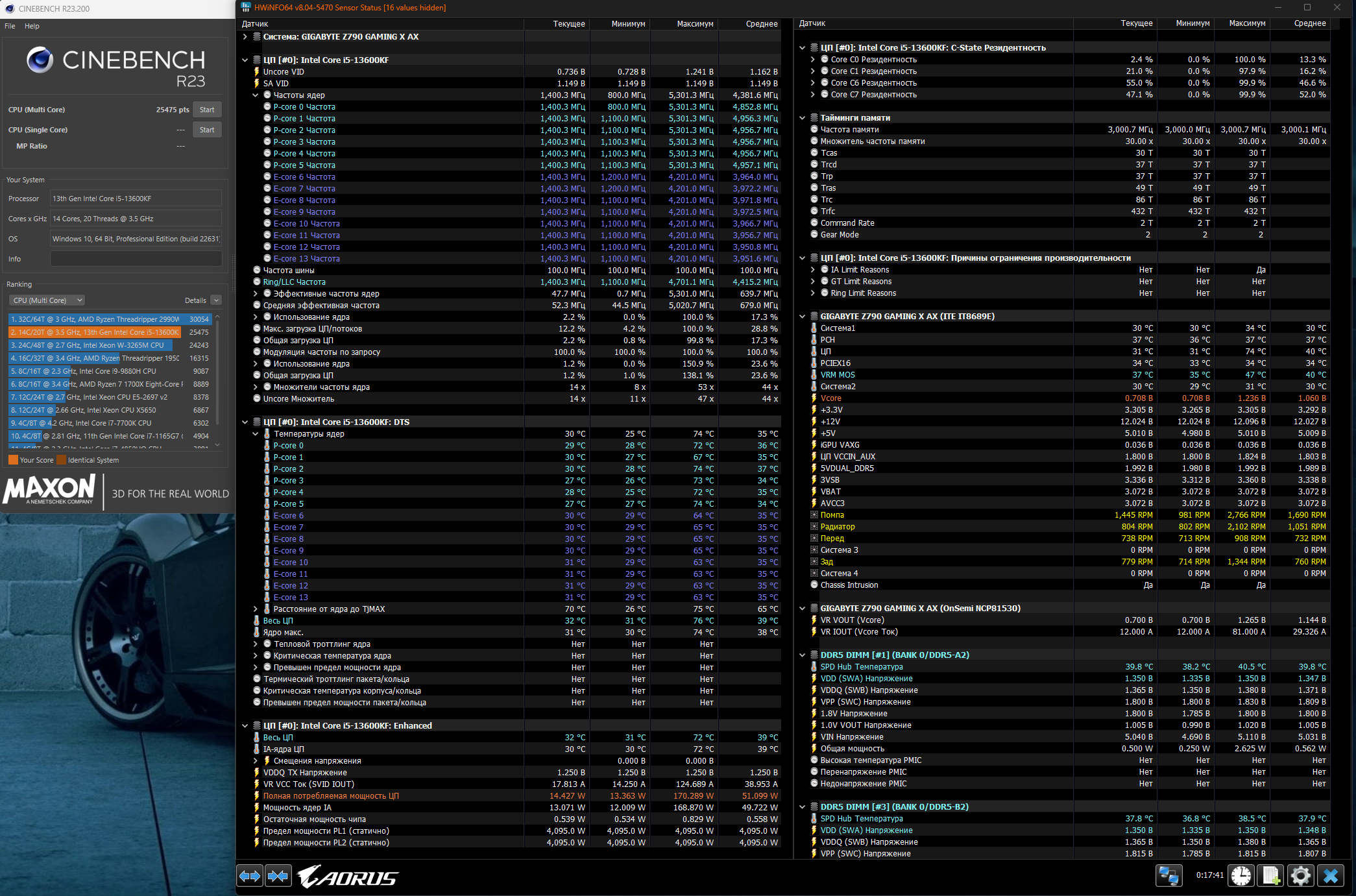 max77 13600KF 5300/4200 почти такой же результат в Cinebench23, как у тебя (25475 балла). И да, +100МГц по малым ядрам добавило 200 баллов. При 5300/4100 было 25275 балла.