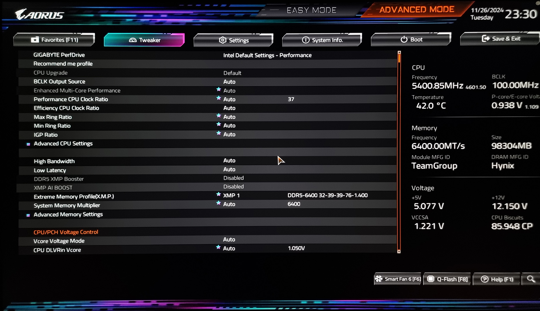 Скажу честно, в разгоне процов я ничего не понимаю, последний раз разгонял 25 лет назад Celeron 300A до 450 Мгц, и более разгоном процессоров никогда не занимался... Как в Биос по дефолту стоял стандартный профиль процессора - Performance, так я его и не трогал.