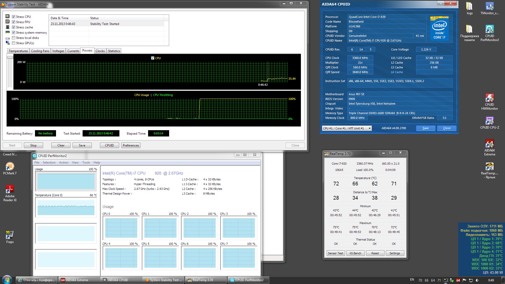 BCLK 160, Vcore 1.2v, QPI 1.25v, память 1.5v, x21 множитель, HT включен - 3360MHz, память 1600Mhz