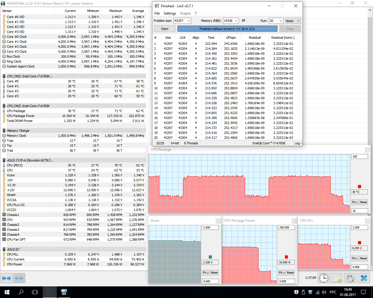 Сколько несовпадающих невязок, хоть и "without errors"... В итоге решил остановиться на тех же 4500/1.392-1.408 с запасом, память 3000/15-15-15-36-2, 1.35 В, для верности vccio 1.1, vccsa 1.175.