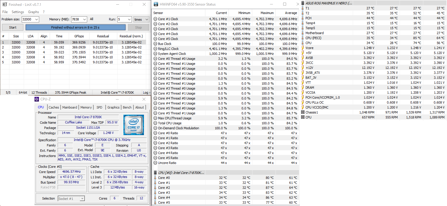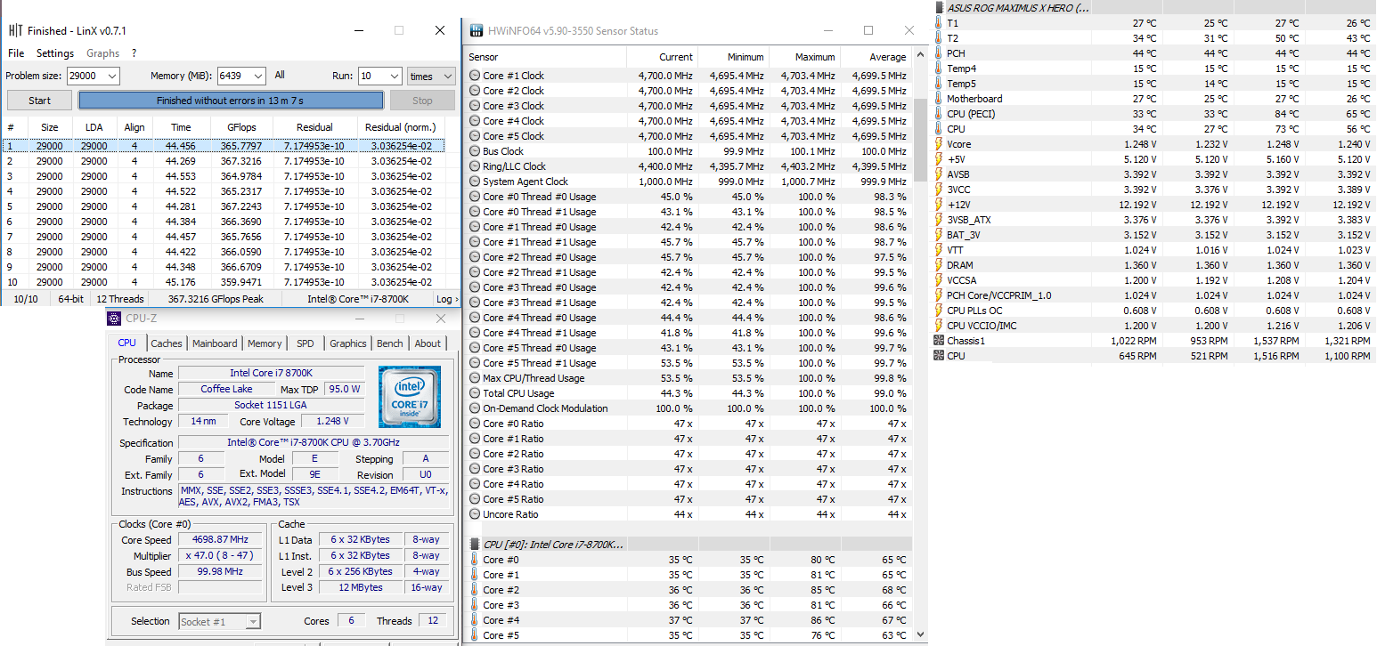 Полученный результат должен иметь следующий вид: Скриншот рабочего стола после прохождения >9 циклов (т.е. между 9 и 10 проходами). Вместе с LinX на рабочем столе должны быть развернуты CPU-Z (первая вкладка) и Core Temp, это обязательный минимум. Такой набор программ даст информацию о напряжении и температурах под нагрузкой-простоем. По желанию можете добавить другие программы, показывающие дополнительную информацию о вашей системе, например третью вкладку CPU-Z, которая покажет модель материнской платы и версию BIOS. Пример результата разгона: Mad Max, 5100 МГц (AVX 0), i7-8086K, HT-ON, Cache 4700, Vcore=1.36V, Batch L805E123, Gigabyte Z370 Aorus Gaming 7 (bios F6), Be Quiet! Dark Rock Pro 4, ЖМ под HS, Windows 10 Pro 64-bit 1809, LinX 0.9.3 64bit.