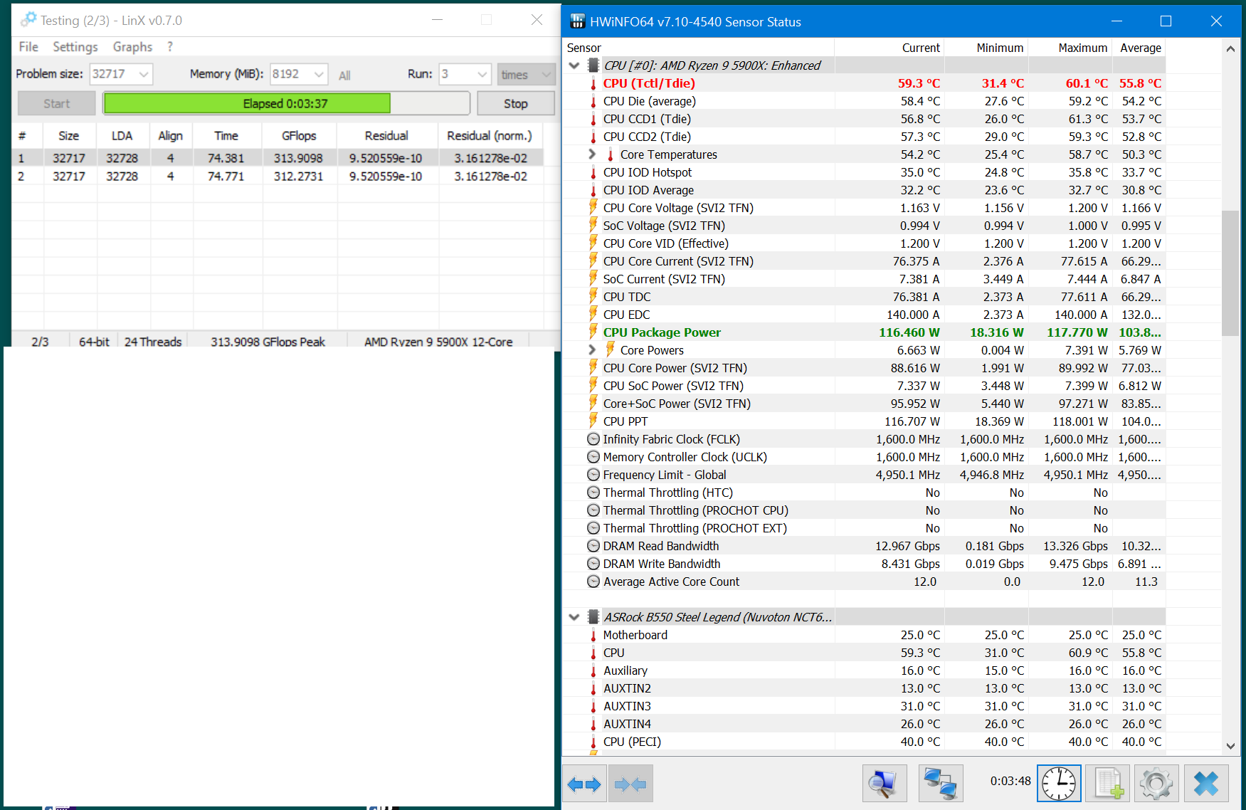 Помогите разобраться. Перешёл с Интела X99 на АМД, но почему-то получаю низкие результаты в линкс на 5900Х. Всего 300 попугаев, причём процессор потребляет всего 115Вт и не грееется. В синебенче и при кодировании видео получаю нормальные результаты. Память, хоть и с высокими задержками, но работает нормально.