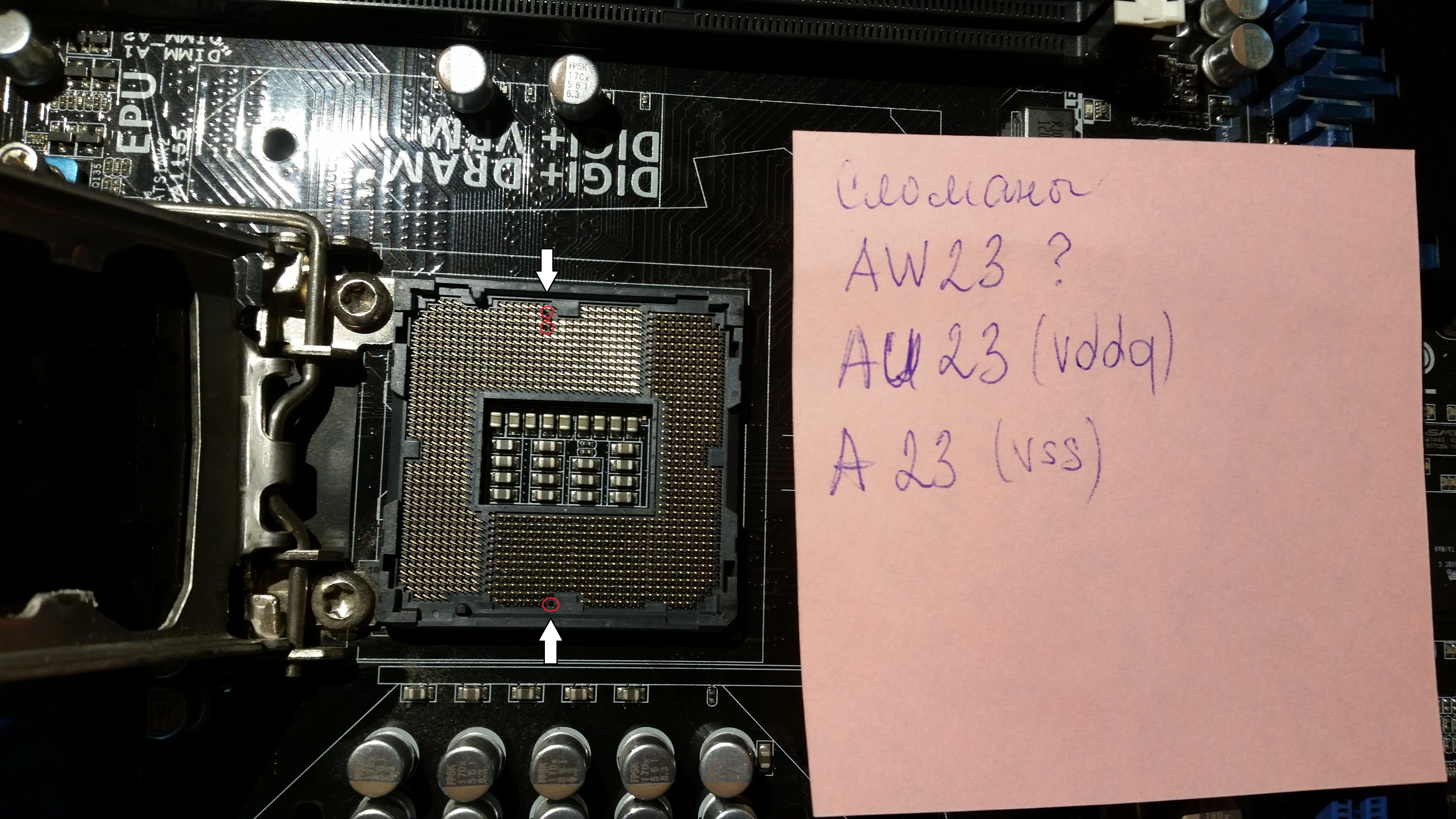 sergey_stash можешь делать только AW23(относится к памяти ддр3), на остальные можно забить. dddduh у тебя загнута ножка питания A25(если правильно разобрал на фото),их там сотни в паралель сделаны, выпрями ее обратно и проследи чтоб не коротила и не задевала соседние, потом можешь ставить проц обратно и эксплуатировать