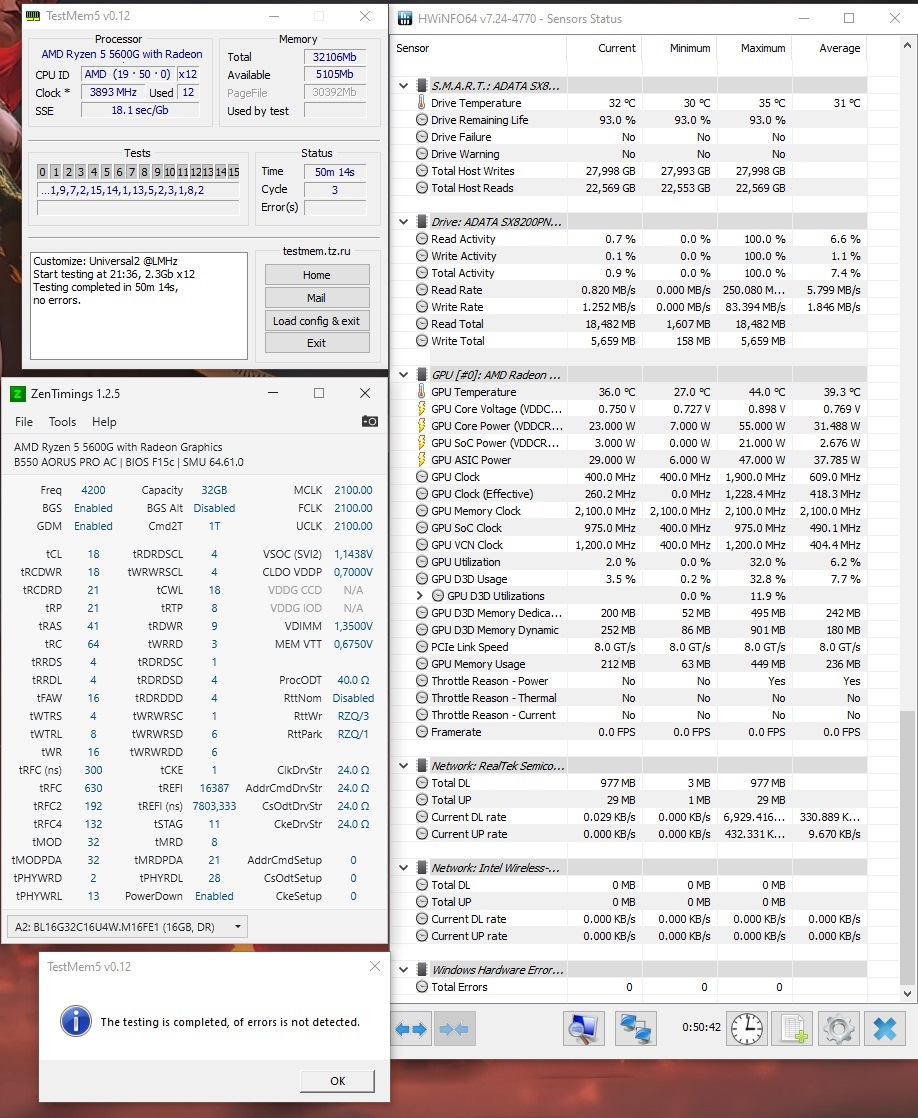 Каков уровень моей удачи, если первый 5600g не мог в uclk выше 2133, а второй не может в fclk выше 2100? Первый, кстати, сдох (сначала его потеряли на почте, но он нашёлся по итогу) на 7ой день. Видимо и странный мониторинг материнки тоже от него был. И, получив на руки второй, оказалось, что у 1го ещё и ооочень долго инициализировплось видео ядро, новый это делает в 2-3 раза быстрее.