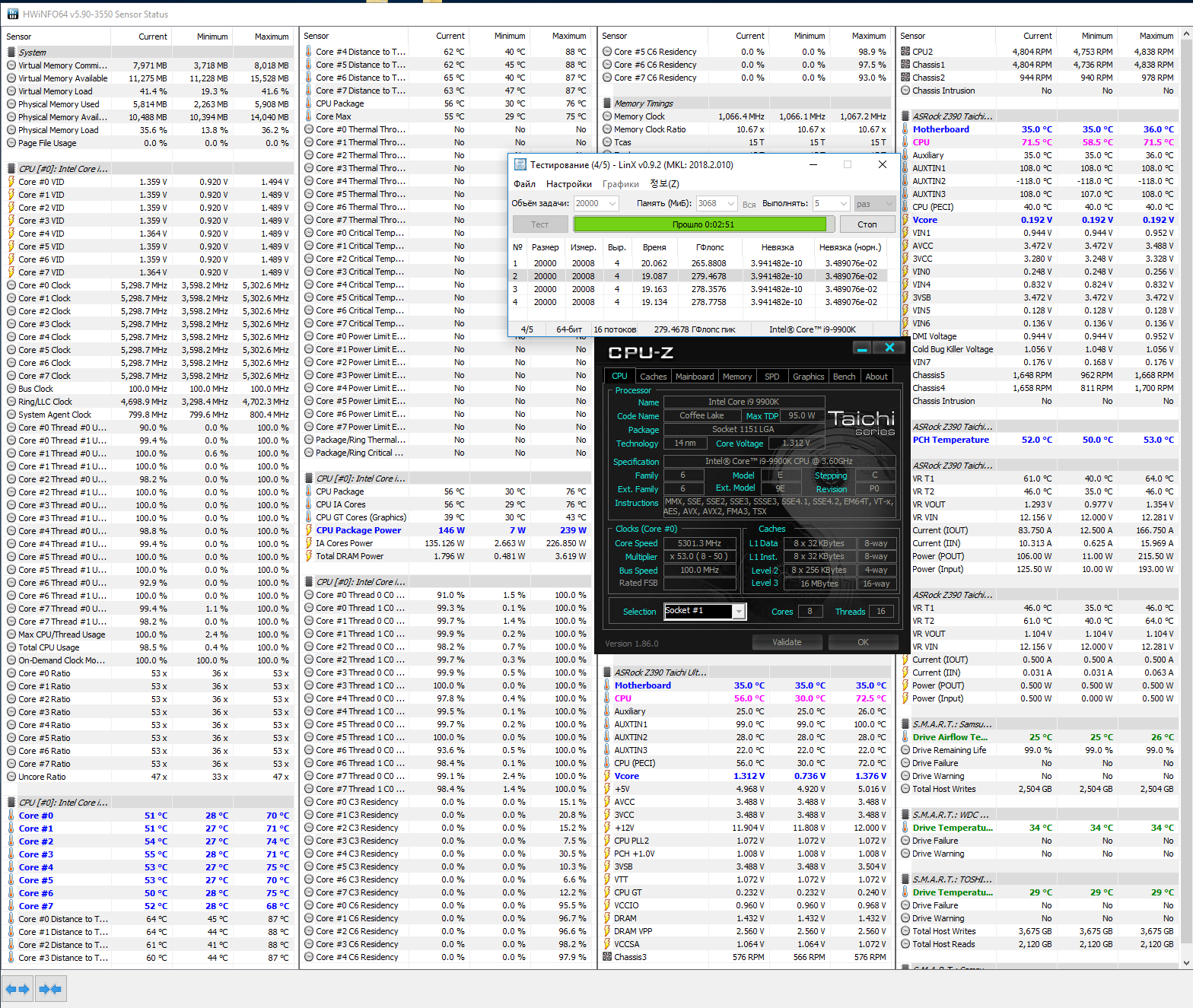 Полученный результат должен иметь следующий вид: Скриншот рабочего стола после прохождения >9 циклов (т.е. между 9 и 10 проходами). Вместе с LinX на рабочем столе должны быть развернуты CPU-Z (первая вкладка) и Core Temp, это обязательный минимум. Такой набор программ даст информацию о напряжении и температурах под нагрузкой-простоем. По желанию можете добавить другие программы, показывающие дополнительную информацию о вашей системе, например третью вкладку CPU-Z, которая покажет модель материнской платы и версию BIOS. Пример результата разгона: Mad Max, 5100 МГц (AVX 0), i7-8086K, HT-ON, Cache 4700, Vcore=1.36V, Batch L805E123, Gigabyte Z370 Aorus Gaming 7 (bios F6), Be Quiet! Dark Rock Pro 4, ЖМ под HS, Windows 10 Pro 64-bit 1809, LinX 0.9.3 64bit.