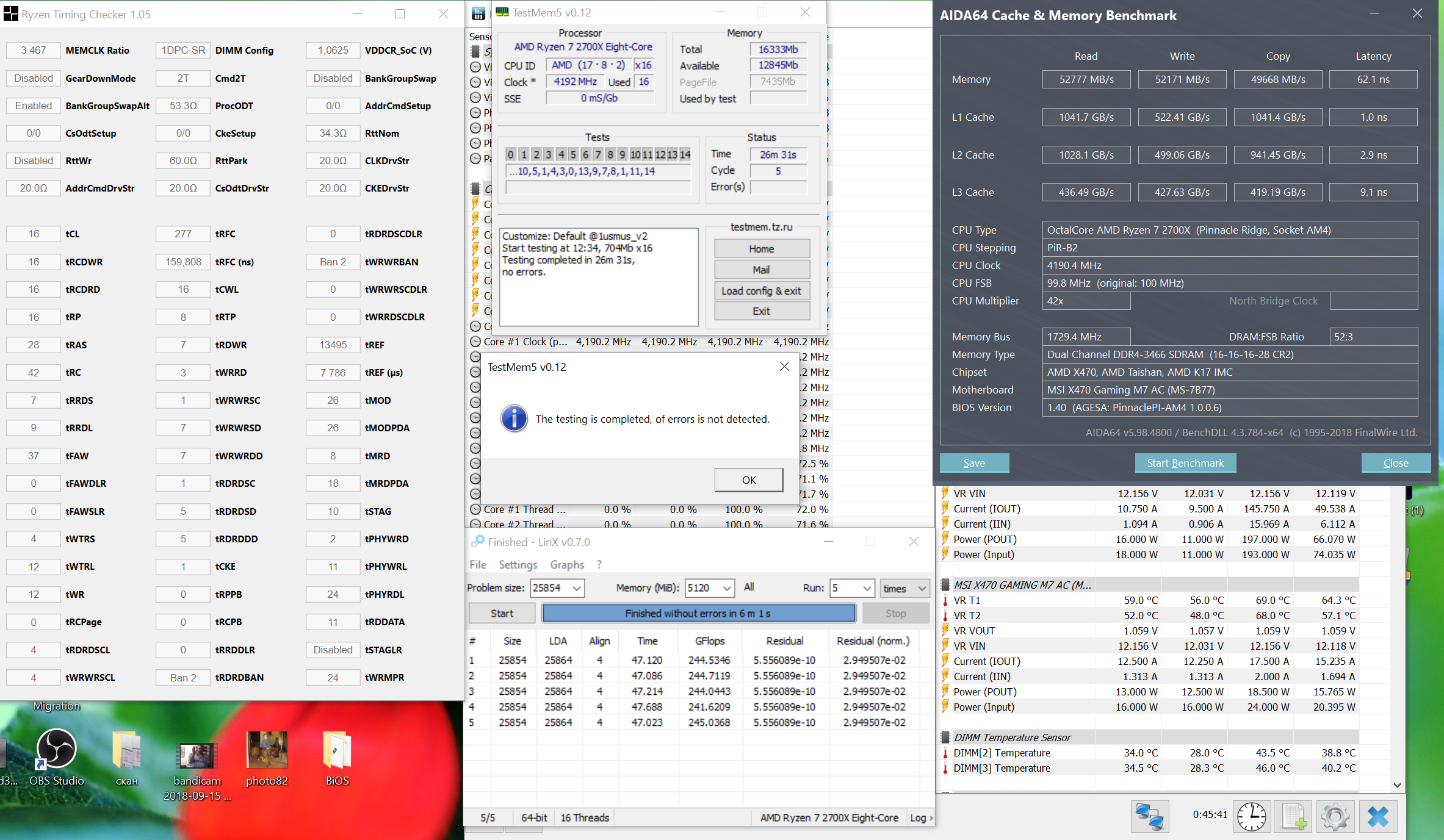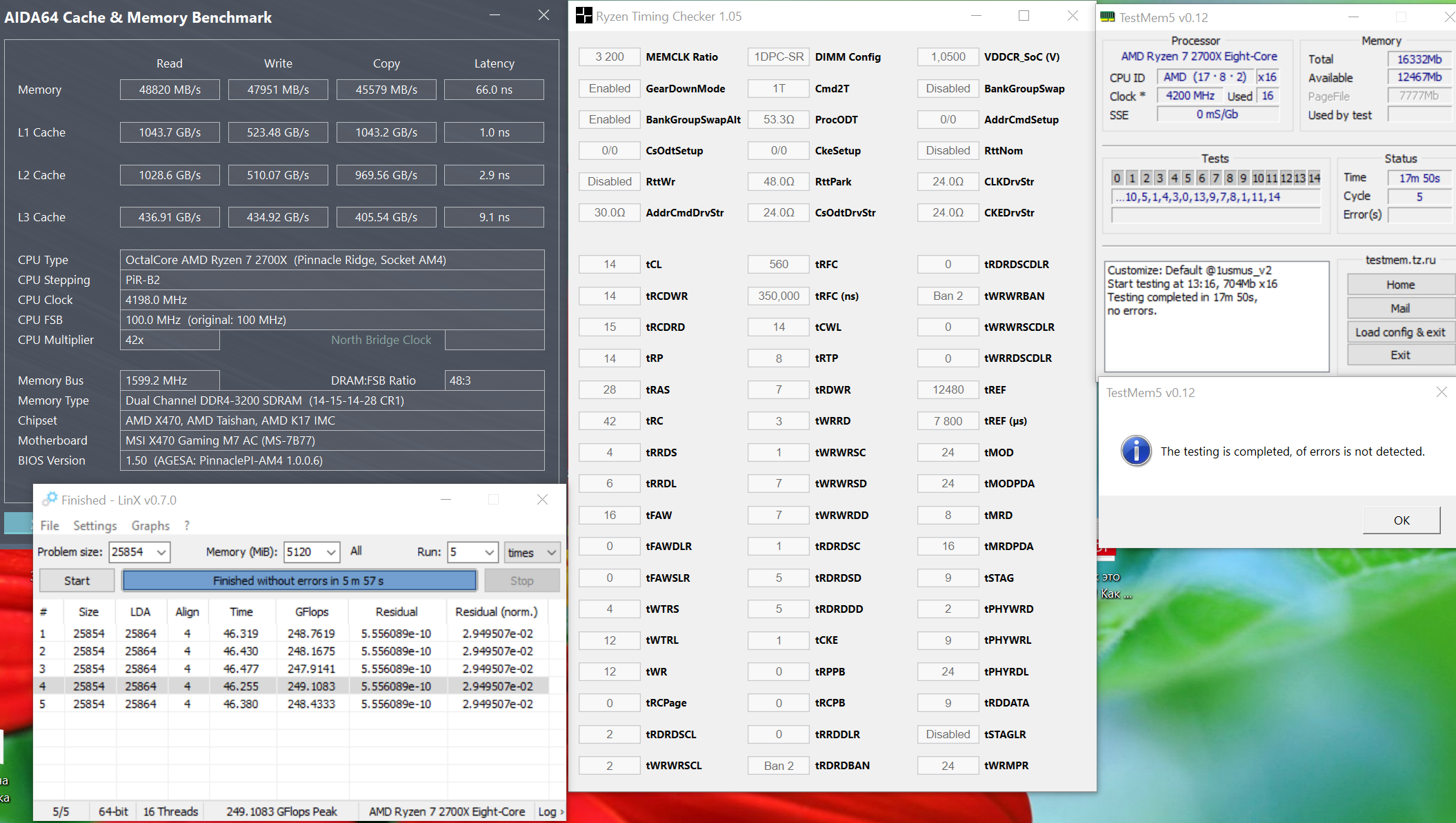 А вот тут я немного не согласен - Вы хотите смотреть в программе AIDA? Которая своим алгоритмом покажет вам свою оценку производительности памяти, но это некий абстрактный показатель) Давайте попробуем понять - что мы хотим от памяти на Ryzen? 1 Максимальную частоту - потому что повышается пропускная способность памяти. 2 Инфинити фабрик завязан на частоту памяти - т.е. косвенно мы повышаем скорость обработки данных К процессору-От процессора и Внутри процессора. 3 Снизить тайминги памяти - для повышения скорости обработки данных. Все наши старания должны вылиться - В повышении производительности в реальных задачах. Но максимальная частота и Максимально низкие тайминги - не совсем совместимы.В каждом конкретном случае лучше искать баланс, т.к. повышение частоты памяти повлечет за собой повышение напряжения на компоненты и увеличение таймингов. У меня остались скрины процесса настройки частота/тайминги памяти на одной частоте 3446. Разница в тетсте AIDA меняются несущественно, а вот скорость прохождения ТМ5 с конфигом куратора разнится существенно. Почему я обращаю внимание на время прохождения ТМ5 - по мониторингу HWINFO проц загружается на 100%. Это некая реальная задача с отличной повторяемостью - которая показывает именно насколько быстро проц получает/отдает данные приложению, опять же насколько стабильно. Во всех случаях процессор на фиксированном разгоне до 4.2 3446 16-16-16-16-28-42