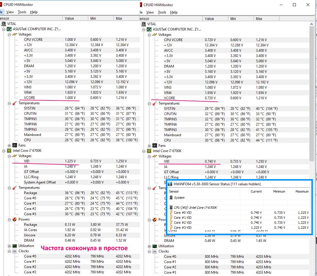Я имел ввиду вот что: Слева скочек кратковременный и VID подскочил до 1.225, справа полный покой, это в адаптиве. В мануале 1.345 показывало, при этом Vcore 1.22 был при БэнчЕ CPU-Z (в адаптиве Vcore 1.22, вид 1.25) Или это какой-то сторонний датчик? Вдобавок наложил HWiNFO64