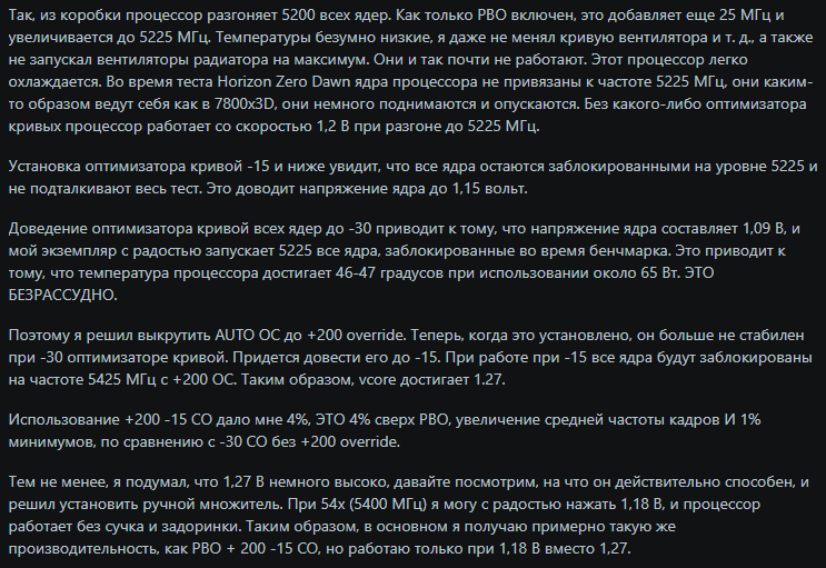 Да, я согласен что настроить ПБО по-ядерно на 16 рыл это будет сложнее, я говорю про то, что при фиксе 16 ядер будут греться сильнее, чем при 6 ядрах. Поэтому здесь выгоднее ПБО настроить, можно даже по всем ядрам. Если память я готов сидеть настраивать и рвать оставшиеся волосы на голове из-за ошибок, то из-за кривой ядер, я пока что, к счастью, не готов. И даже когда я возьму 9700Х в скором времени, я бы тоже туда бахнул фикса наверное, Но это уже личное предпочтение, никого не принуждаю и не заставляю.