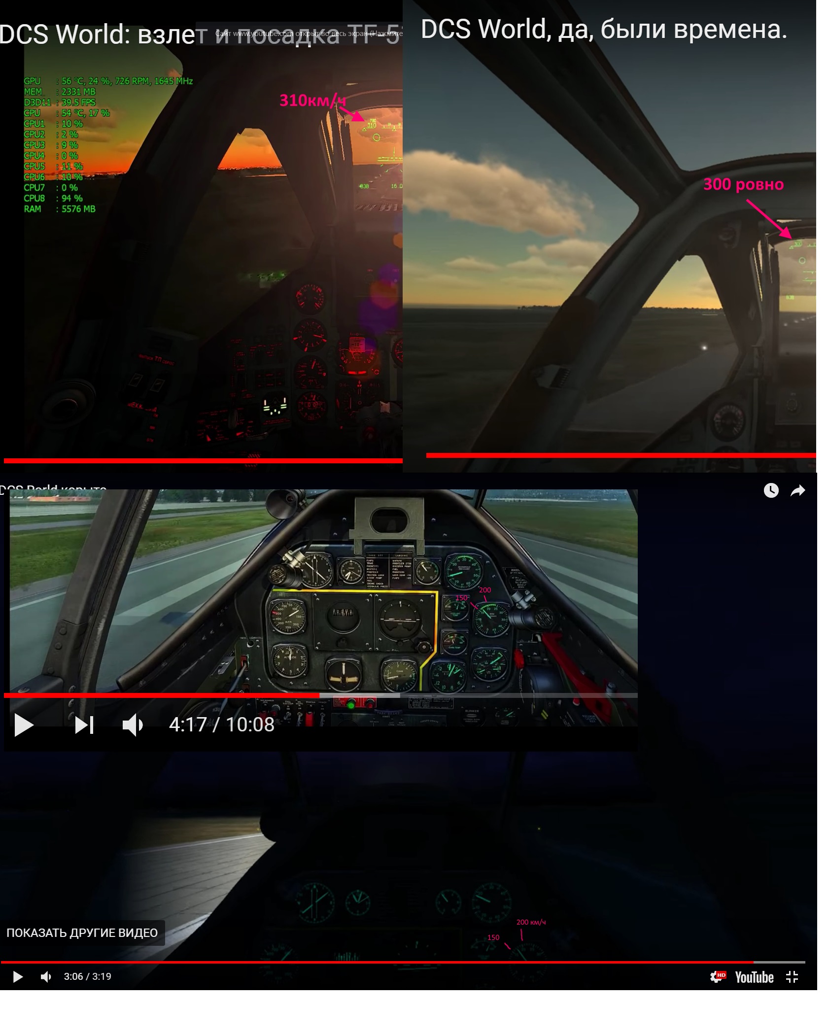 - но можно заметить как протыркивается картинка слегка (небо особенно, при крене) при покачивании или крене самолета и от этого кажется что самолет быстрее летит менее управляем я и написал до этого кажется что летит как "Гаечный ключ" с двигателем. (правда запись ЦП еще осуществлял, но и без записи такая же фигня) При посадке на лобовом индекаторе сверху слева зеленым " 300+"- (посадочная скорость) - и на 1м и на 2м видео на СУ 25Т - одинаковая скорость - но на 2м видео кажется что самолет быстрее летит - нет плавности в картинке!