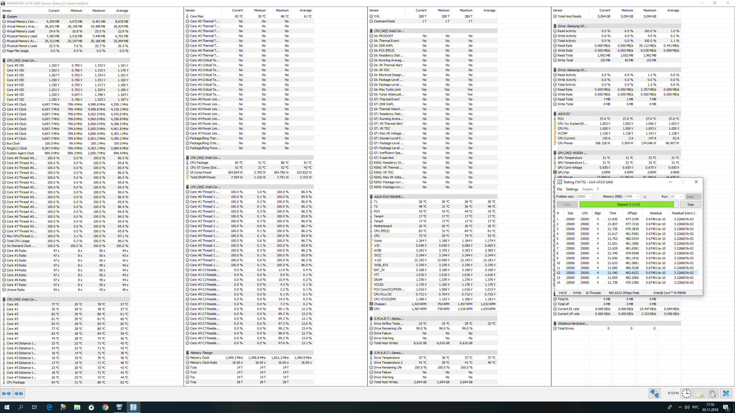 Полученный результат должен иметь следующий вид: Скриншот рабочего стола после прохождения >9 циклов (т.е. между 9 и 10 проходами). Вместе с LinX на рабочем столе должны быть развернуты CPU-Z (первая вкладка) и Core Temp, это обязательный минимум. Такой набор программ даст информацию о напряжении и температурах под нагрузкой-простоем. По желанию можете добавить другие программы, показывающие дополнительную информацию о вашей системе, например третью вкладку CPU-Z, которая покажет модель материнской платы и версию BIOS. Пример результата разгона: Mad Max, 5100 МГц (AVX 0), i7-8086K, HT-ON, Cache 4700, Vcore=1.36V, Batch L805E123, Gigabyte Z370 Aorus Gaming 7 (bios F6), Be Quiet! Dark Rock Pro 4, ЖМ под HS, Windows 10 Pro 64-bit 1809, LinX 0.9.3 64bit.