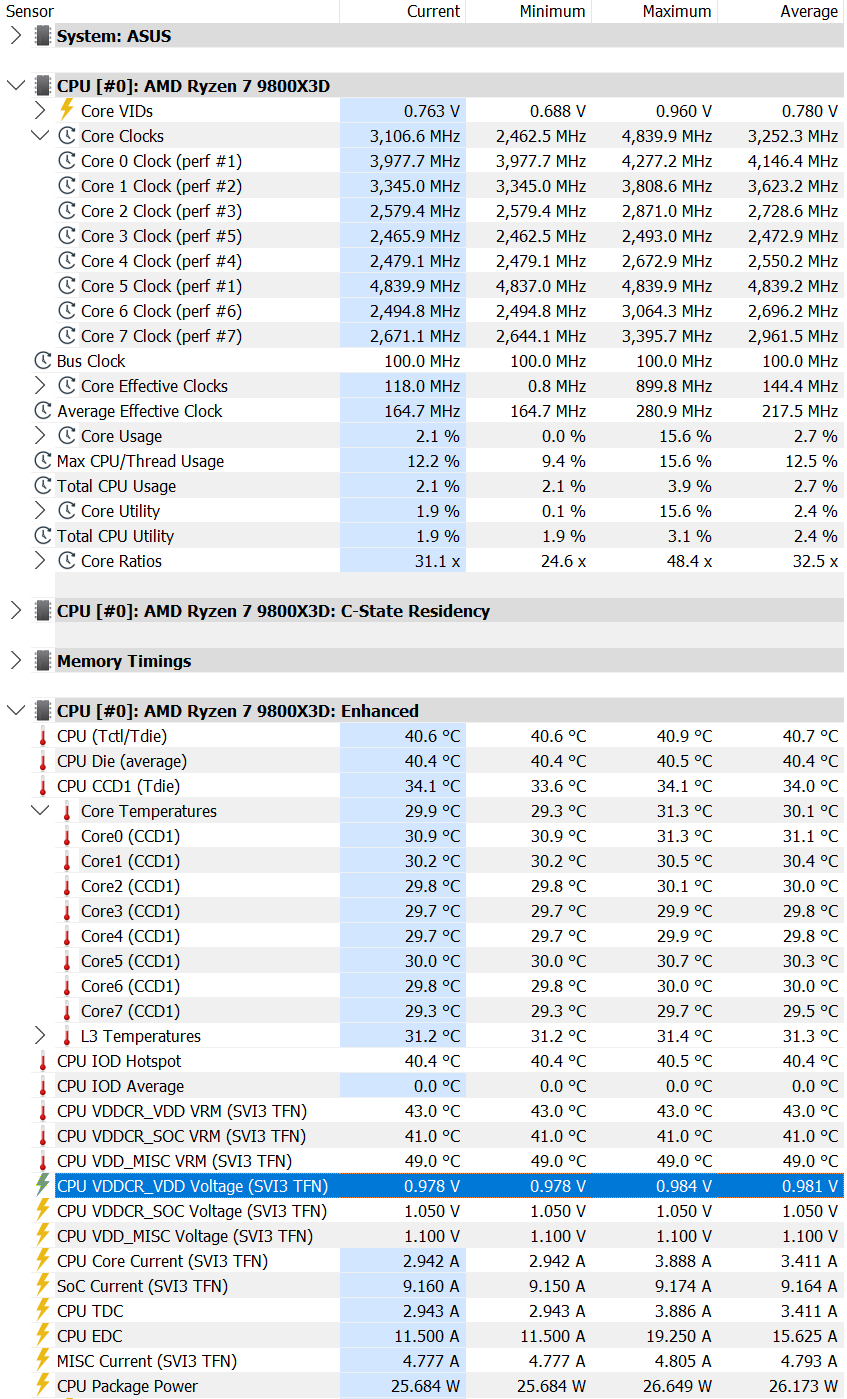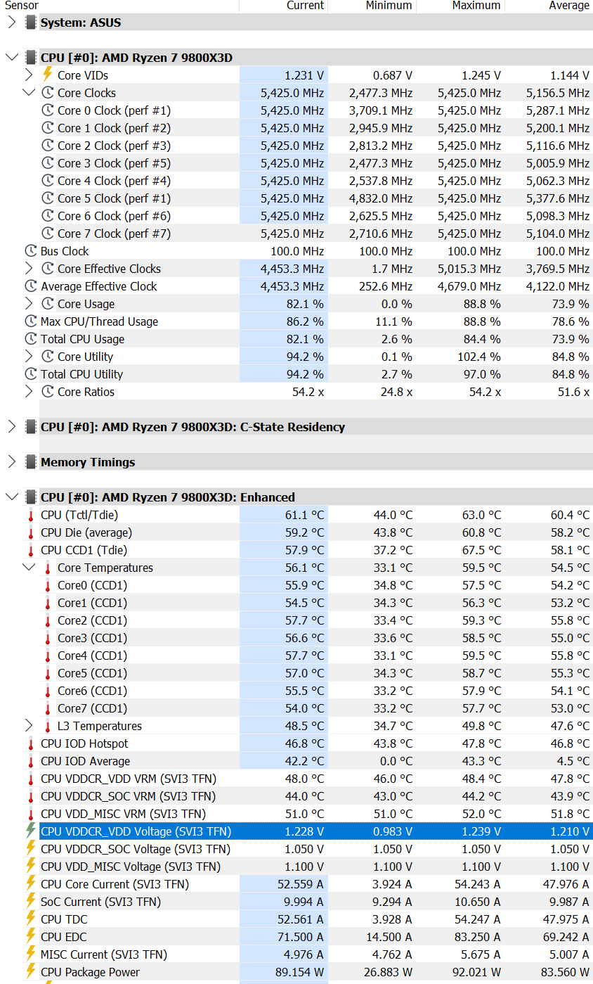 Я по началу тоже как собрал систему на 9800X3D, попробовал фикс поставить, уже не помню, но вроде около 1.1в. При этом VSOC стоял 1.05 тоже фикс. Так вот походу из-за того, что еще была включена PBO (+200Mhz, CO -30, Scalar X5) после загрузки системы я в HWinfo увидел значение CoreVIDs около 1.380. Быстро вернул вольтаж в авто (vsoc оставил 1.05) и больше не экспериментировал. Благо хоть не успел бенчи запустить. Сейчас оставил Scalar в X1, не надо мне X5.