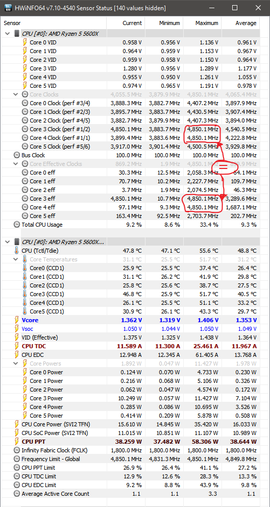 При этом методе игнорируется лимит EDC, лимит TDC настраивается исходя из возможностей VRM, какой ток в амперах материнская плата может максимально выдать не перегревая VRM, лимит PPT это максимальное потребление процессора, особенно актуально если система охлаждения очень инертная. 5900X/5950X упрутся в температурный лимит в 90°С на самом горячем CCD, 5600X/5800X в 95°С, эти значения можно уменьшить при помощи настройки Platform Thermal Throttle Limit. Последние 5°С до этого лимита дают приличные пенальти к бусту.