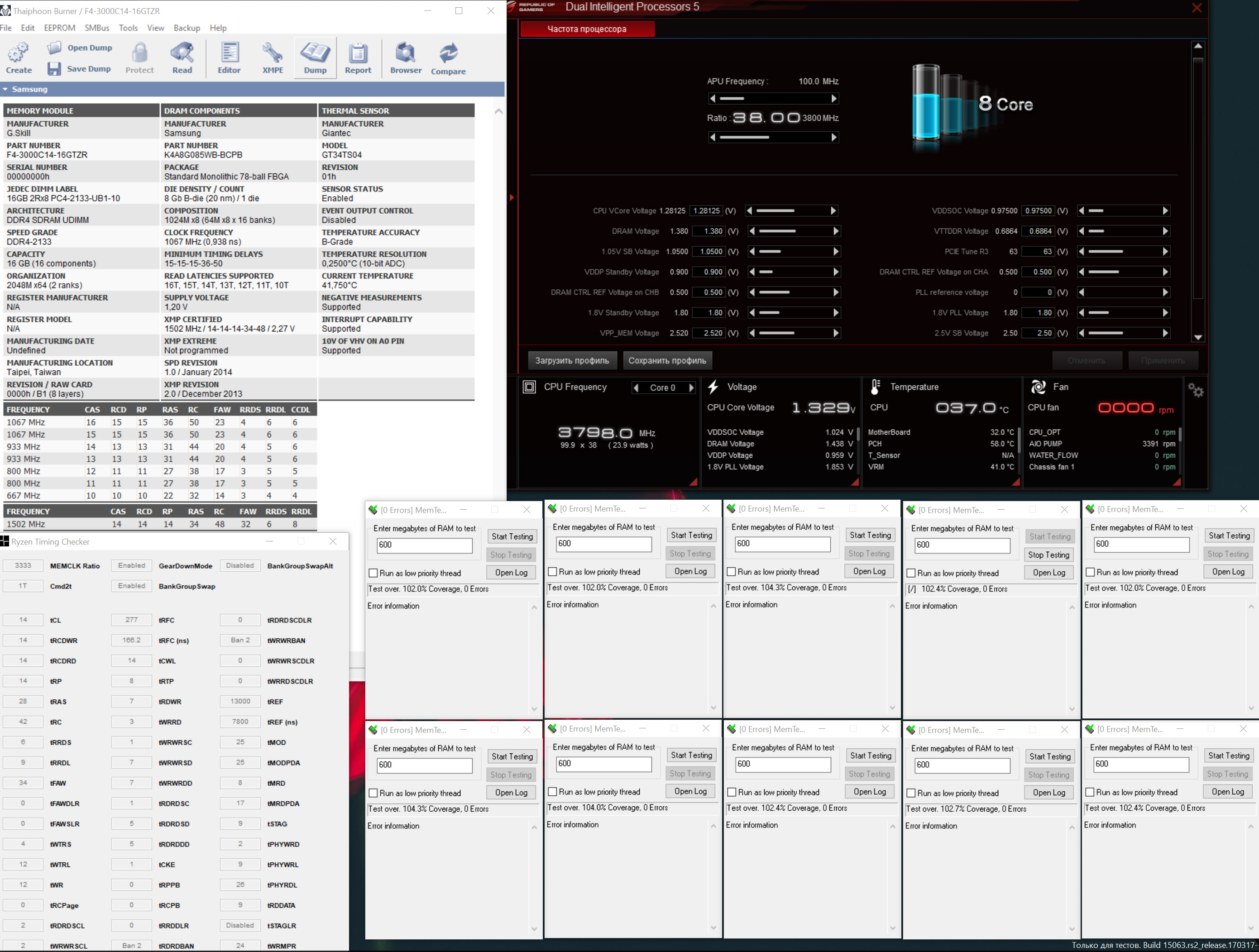 - Обычно поставляется в коробке с системой охлаждения Wraith Spire RGB (это круглая конструкция из целого куска алюминия с медной вставкой-испарительной камерой в основании и вентилятором с кольцом разноцветной подсветки, крепится к задней пластине разъёма AM4 четырьмя винтами). - Штатно имеет базовую частоту 3.0ГГц, частоту 3.2ГГц (технология Turbo Boost) при обычной многопоточной нагрузке (Blender n-cores render) и 3.75ГГц (технологии Precision Boost и XFR) при однопоточной нагрузке (Cinebench R15 single core). - Штатное напряжение питания 1.1875В. Может возрастать до 1.3В на отдельных ядрах во время работы Precision Boost и XFR. - Очень энергоэффективный, требования к СО (TDP) - всего 65W. Энергопотребление порядка 10Вт в простое и 85Вт в обычной многопоточной нагрузке (Blender n-cores render).