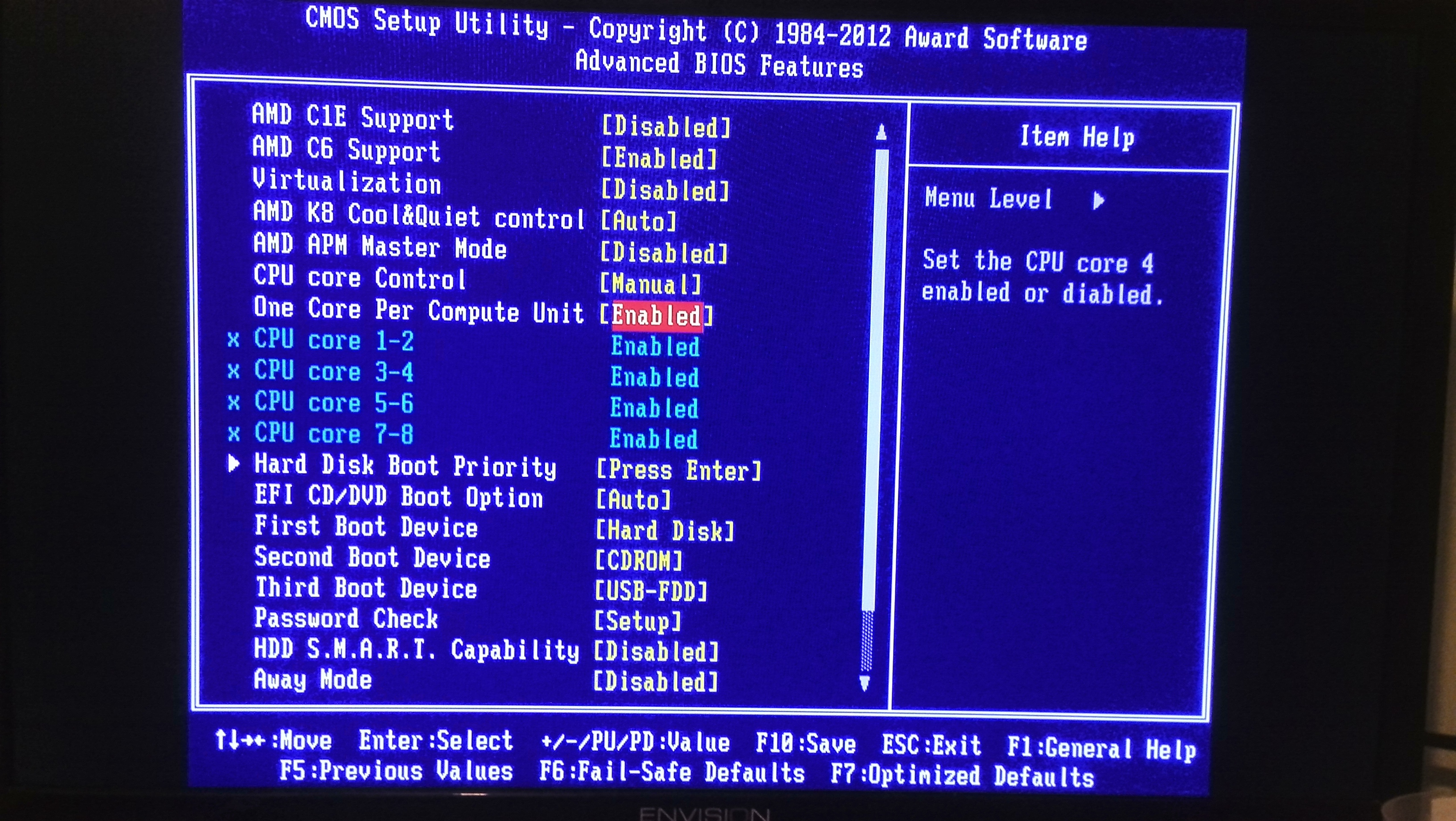 У меня другая материнка. В биос также якобы есть возможность оставить работать одно ядро (хотя это не совсем то, что я изначально имел ввиду), но на деле ничего не выходит и работают сразу 2 модуля! Такая же петрушка скорее всего и с Асроками этими.