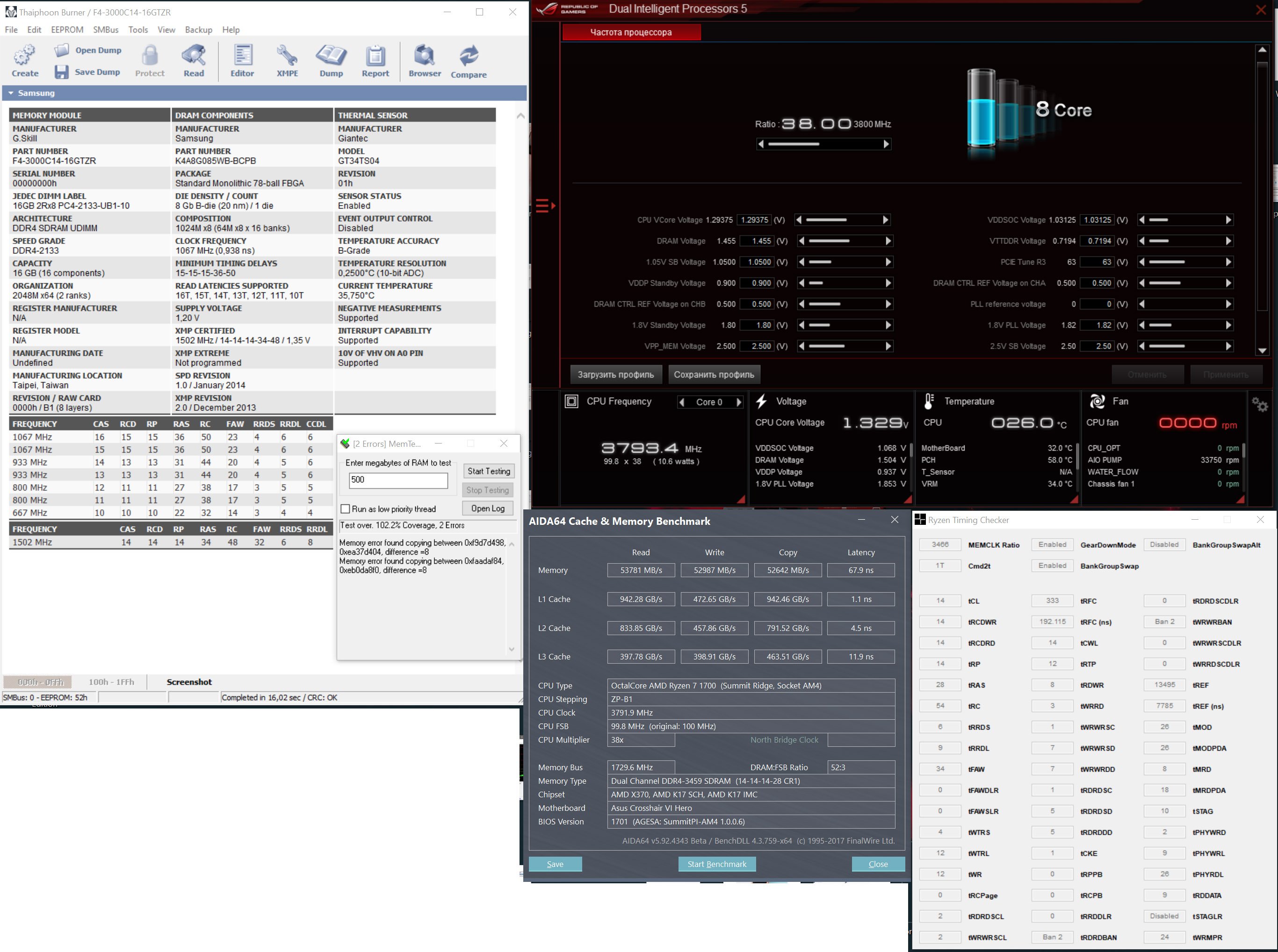 Вопросы детсадовца подъехали, поставил 3.8 частоту процессора с 1.3 V, так же SOC 1.05, + Digi+ power значения. Прошел тесты линкса и аиды, все хорошо. Вот вы обнаружили как бороться с колдбутами поставив профиль дефаулт, так же поставил, поставил V dram на 1.35, и частоту 3200 памяти, не менял настройки таймингов кад_баса и всего остального(авто), попробовал запустить мемтест в 16 окон, не успев запустить последние несколько окон, начал ловить ошибки. Вот собственно вопрос, нужно ли ставить профиль D.O.C.P. для автоматический подборки таймингов? И как вообще на данном этапе мне отлаживать память, что впервую очередь нужно изменить, чтобы пройти этот тест без ошибок. Я боюсь что если сразу выставлю все значения в рекомендуемые гайдами в этой теме, что я снова не смогу понять изза чего вылетают ошибки и синие экраны, изза чего я уже сделал полный сброс настроек и начал все заного