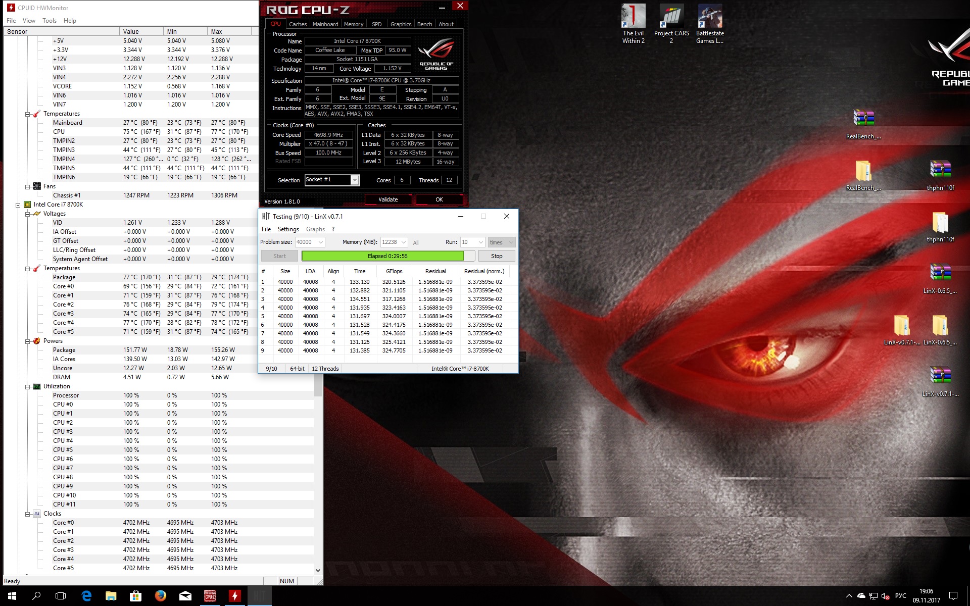 Полученный результат должен иметь следующий вид: Скриншот рабочего стола после прохождения >9 циклов (т.е. между 9 и 10 проходами). Вместе с LinX на рабочем столе должны быть развернуты CPU-Z (первая вкладка) и Core Temp, это обязательный минимум. Такой набор программ даст информацию о напряжении и температурах под нагрузкой-простоем. По желанию можете добавить другие программы, показывающие дополнительную информацию о вашей системе, например третью вкладку CPU-Z, которая покажет модель материнской платы и версию BIOS. Пример результата разгона: Mad Max, 5100 МГц (AVX 0), i7-8086K, HT-ON, Cache 4700, Vcore=1.36V, Batch L805E123, Gigabyte Z370 Aorus Gaming 7 (bios F6), Be Quiet! Dark Rock Pro 4, ЖМ под HS, Windows 10 Pro 64-bit 1809, LinX 0.9.3 64bit.