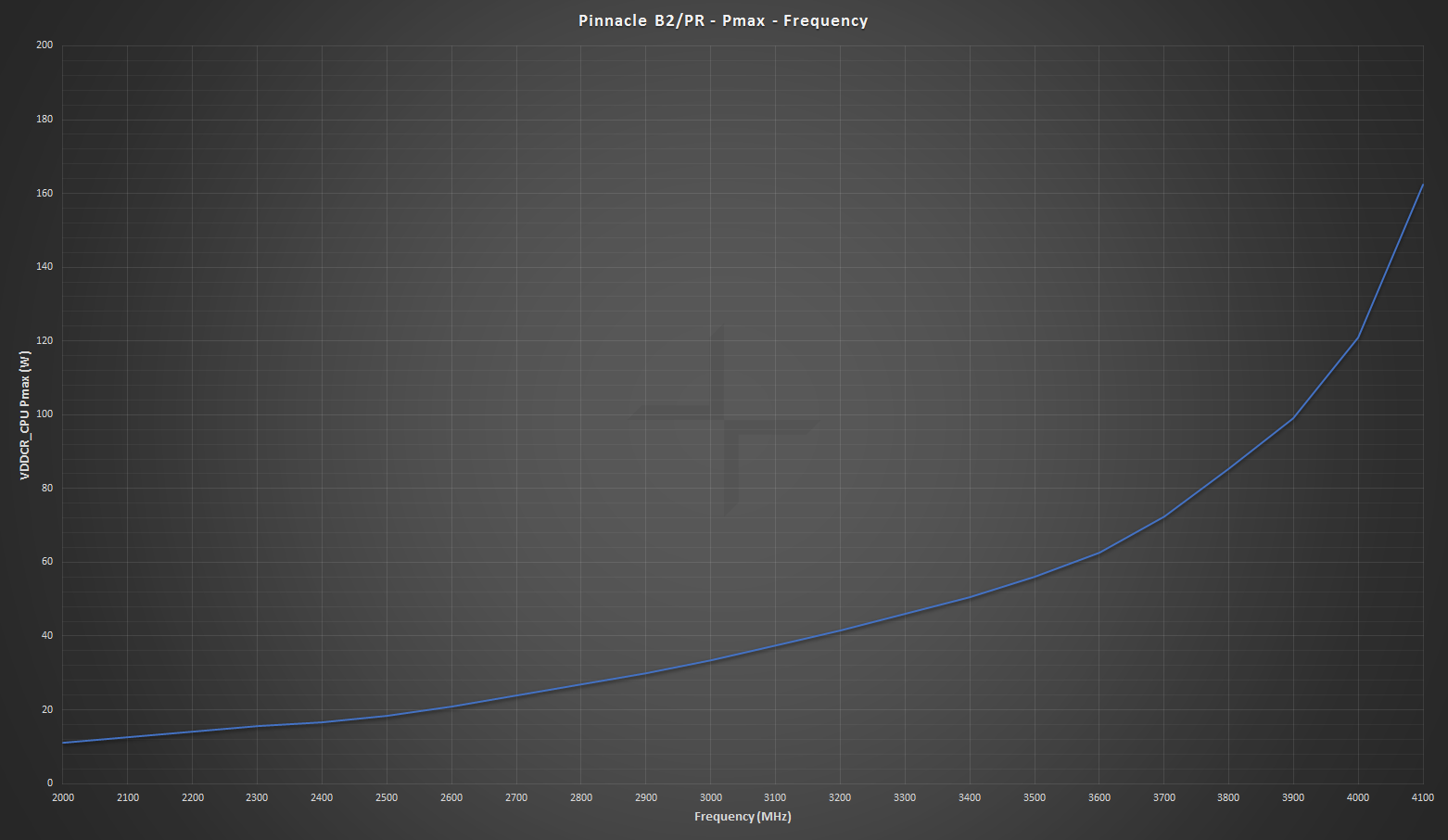 Обратите внимание, что кривая мощности ниже включает только мощность плоскости основного напряжения, используемую самими ядрами ЦП (VDDCR_CPU). Вторая основная плоскость, которая используется элементами CPU SoC (VDDCR_SOC), добавляет к ней 15 - 30 Вт, в зависимости от напряжения SoC.
