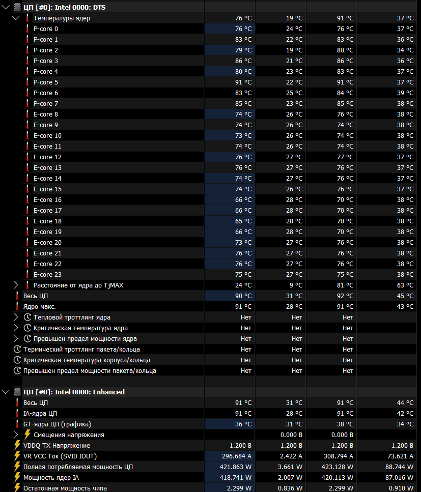 Всем привет, я тут новичек совсем. Поставил 12900hx на мать MSI b760-p wifi ddr4 на 4 слота памяти. 2x16gb стоит. Пока что у меня обычный башня 150W стоит, по этому весь разгон свел к тому что : P core 6 шт 4000hz E core 0 шт Ring 4000hz TDP MAX-MIN 90w Все остальные настройки стоят в АВТО.