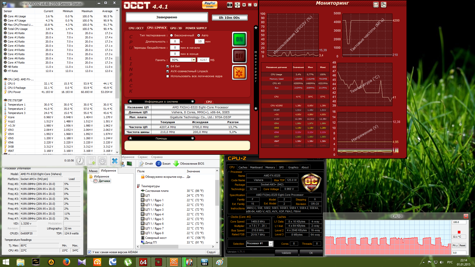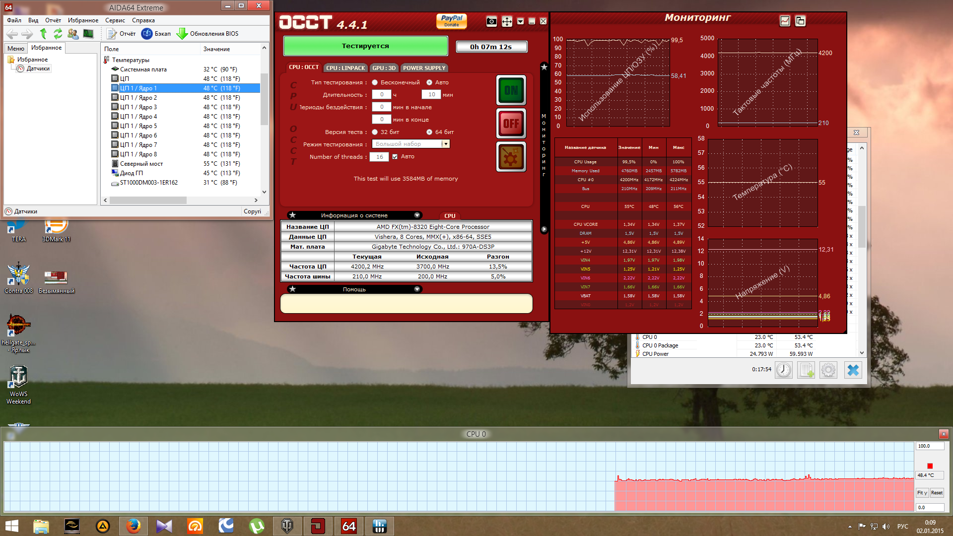 Вот сейчас прогнал, 49 градусов максимум. Вот, прогнал Линпак в ОССТ. Температура - 54 градуса. Но после некоторого времени начинается пилорама на графике температур, означающая, что процессор скидывает частоту.