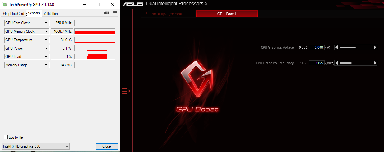 У меня вот так встройка работает, действительно GPUZ не правильно частоту показывает, он всю дорогу стоковые частоты показывает, однако буст видно, 350-700. В действительности же частота поднимается до 1113, как показывает hwinfo.