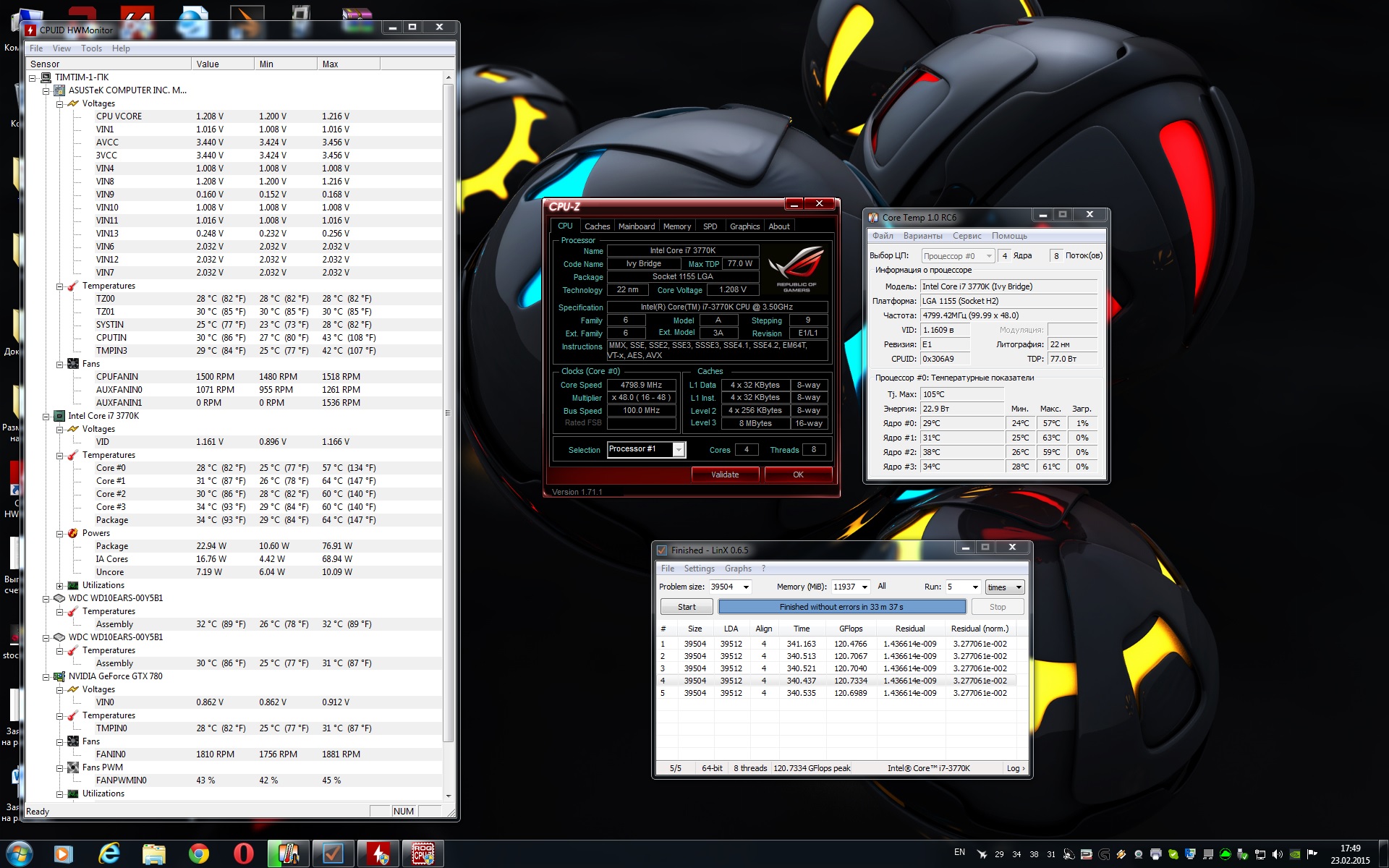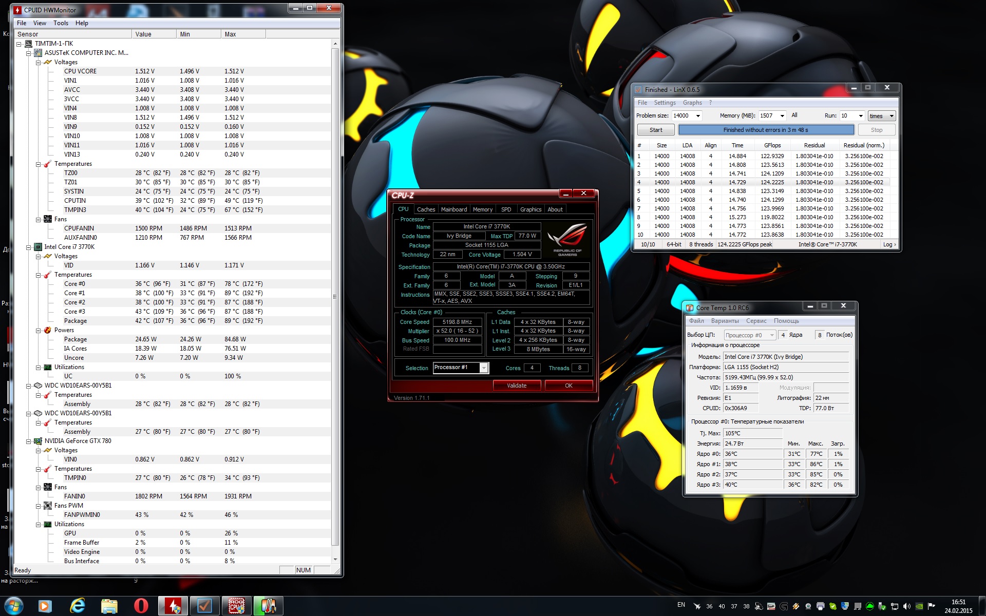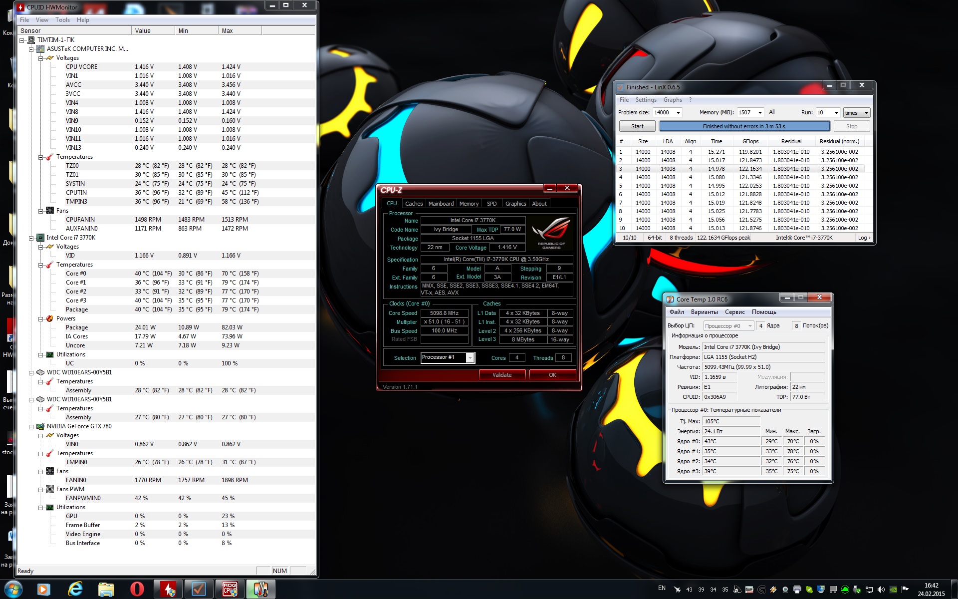 Ребята,нужен ваш совет, первый раз в жизни пытаюсь разогнать процессор и столкнулся с такой ситуацией: процессор i7 3770k работает сейчас на 4,5Ghz при 1.140v , тестил в LinX AVX с объёмом задач 14000 ,15 проходов ,без ошибок. В целом комп работает стабильно, ни каких неожиданных вылетов из системы нет.