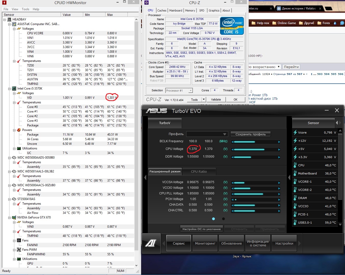 Спасибо. не не нужно так заморачиваться с настройками. Мне просто казалось что 1,3 дохрена почему то, но ща понимаю что всё норм. Мне больше интересно какой софтине показывающей питание на проц верить, от асуса или любой другой? И что интересно, если верить данным то при оффсете +230 это 1,301, но при настройке мануал по питанию если выставить 1,3 то ОС не грузится вообще. Тогда я бы начал верить в данные с софтины асуса, то что 1,37 при оффсете +230. Вот это мне не понятно, если кто объяснит буду благодарен. И не понятна разница (точнее плюсы /минусы) разгона турбобуста или через фикс множитель. Я пробовал и так и так одно и тоже, остался на зафиксированном множителе.